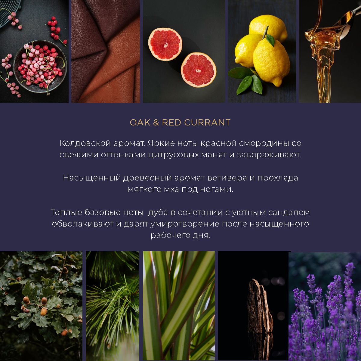 «Oak & Red Currant» (Дуб и красная смородина) Аромат - Колдовской аромат. Яркие ноты красной смородины со свежими оттенками цитрусовых манят и завораживают. Насыщенный древесный аромат ветивера и прохлада мягкого мха под ногами. Теплые базовые ноты дуба в сочетании с уютным сандалом обволакивают и дарят умиротворение после насыщенного рабочего дня.