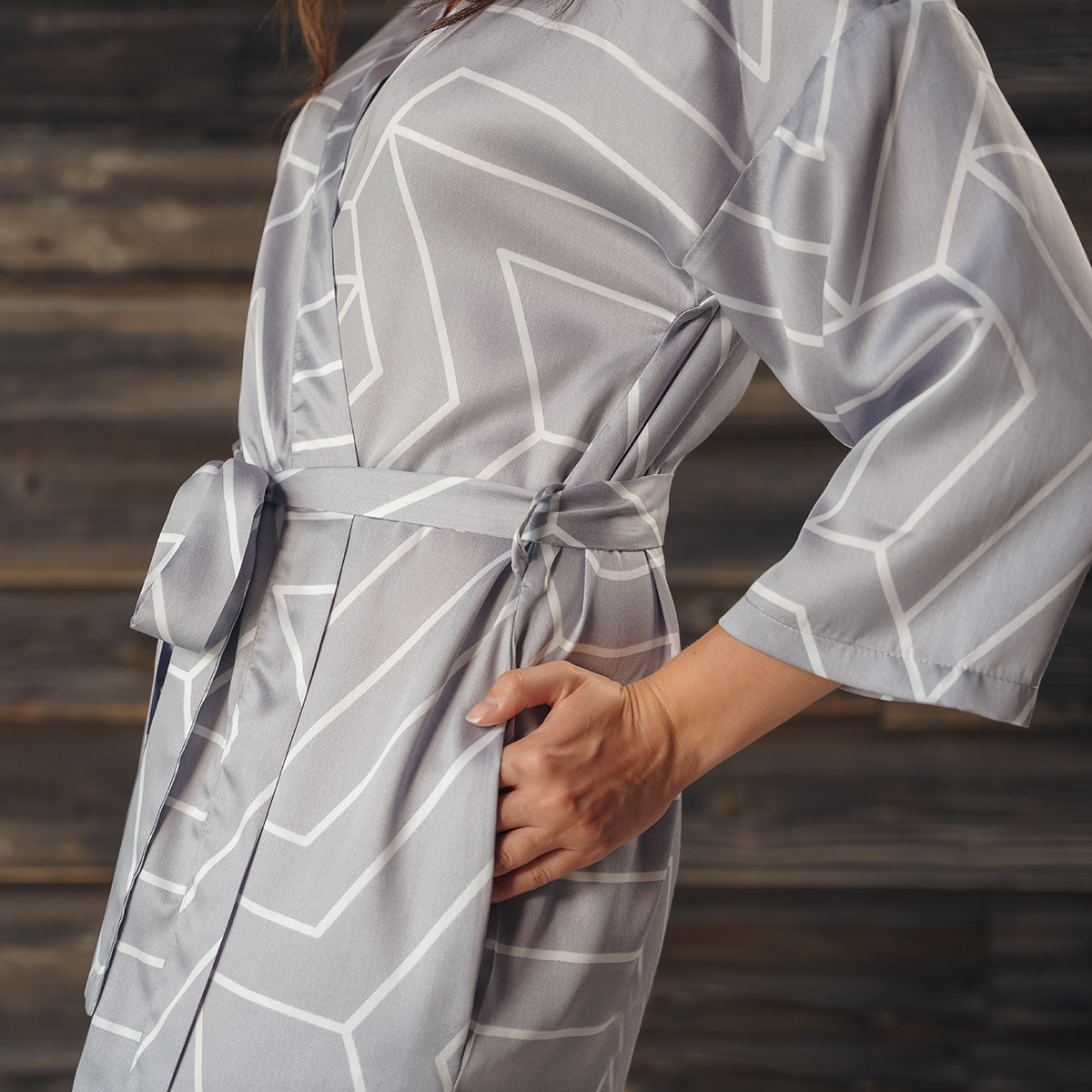 Модель: халат-кимоно, завязывается поясом на запах, имеет внутренние завязки и карманы в швах