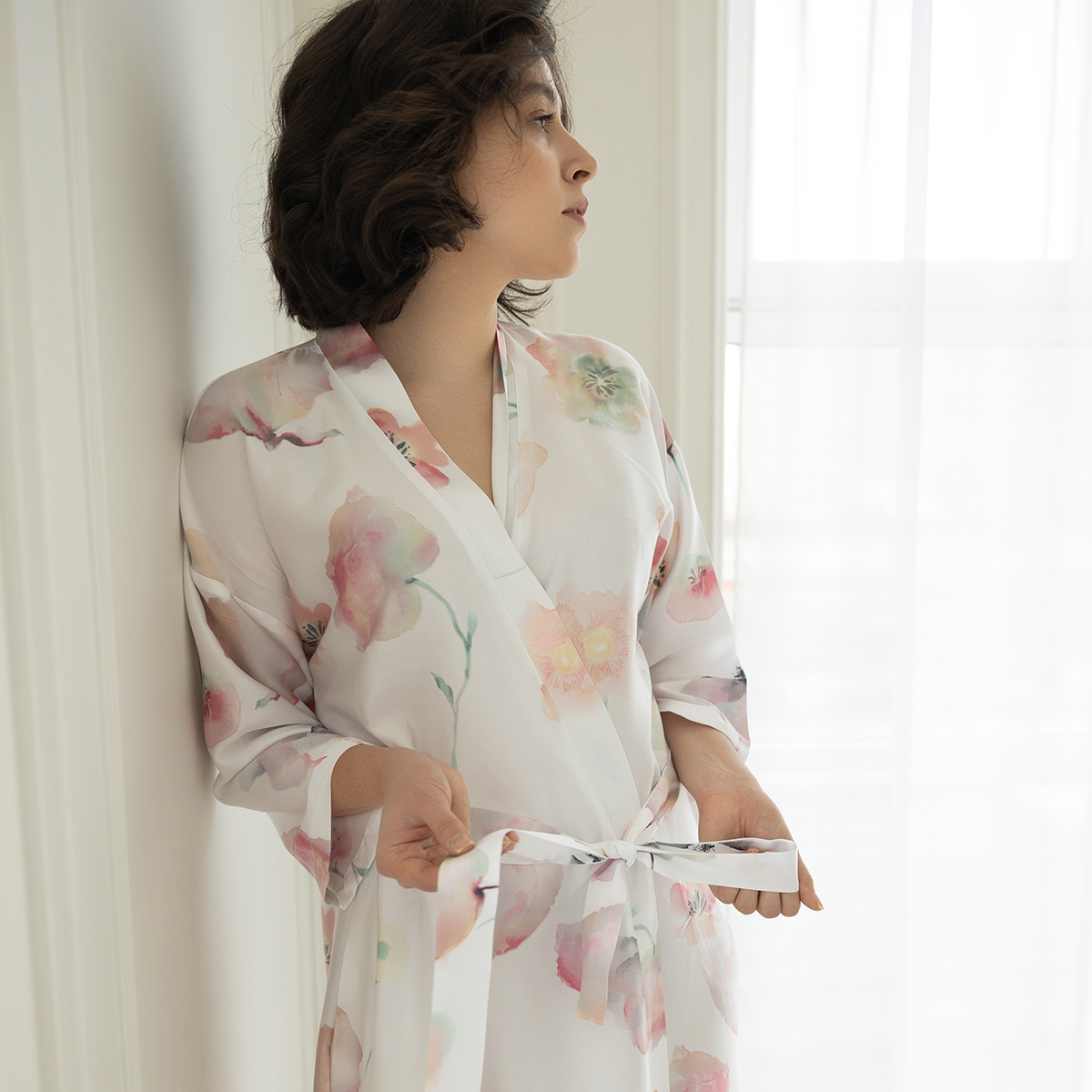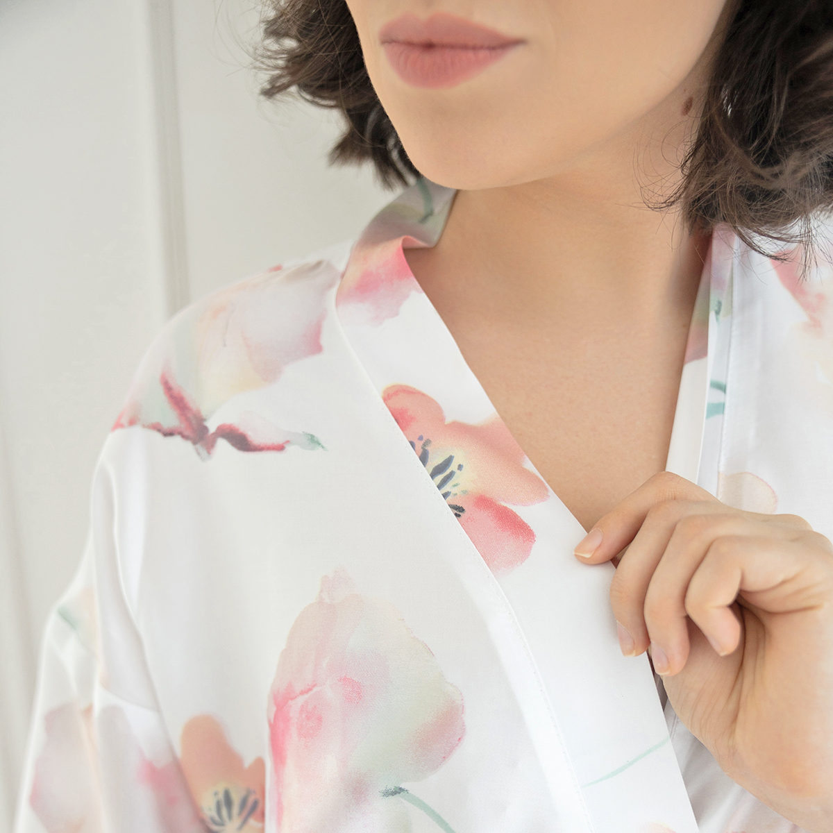 Модель: халат-кимоно, завязывается поясом на запах, имеет внутренние завязки и карманы в швах