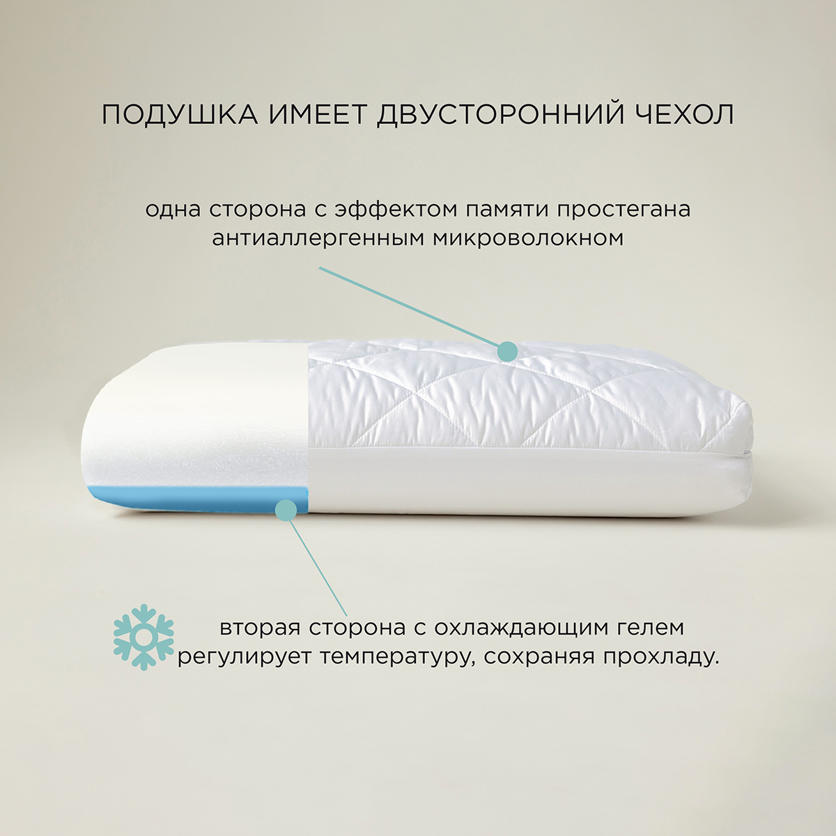 Детали: Двусторонняя подушка с эффектом памяти и охлаждающим гелем. Подходит для наволочек 50х70см