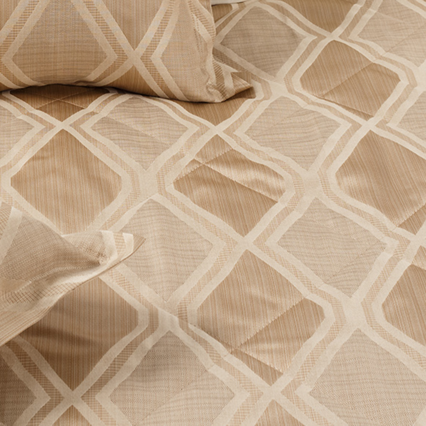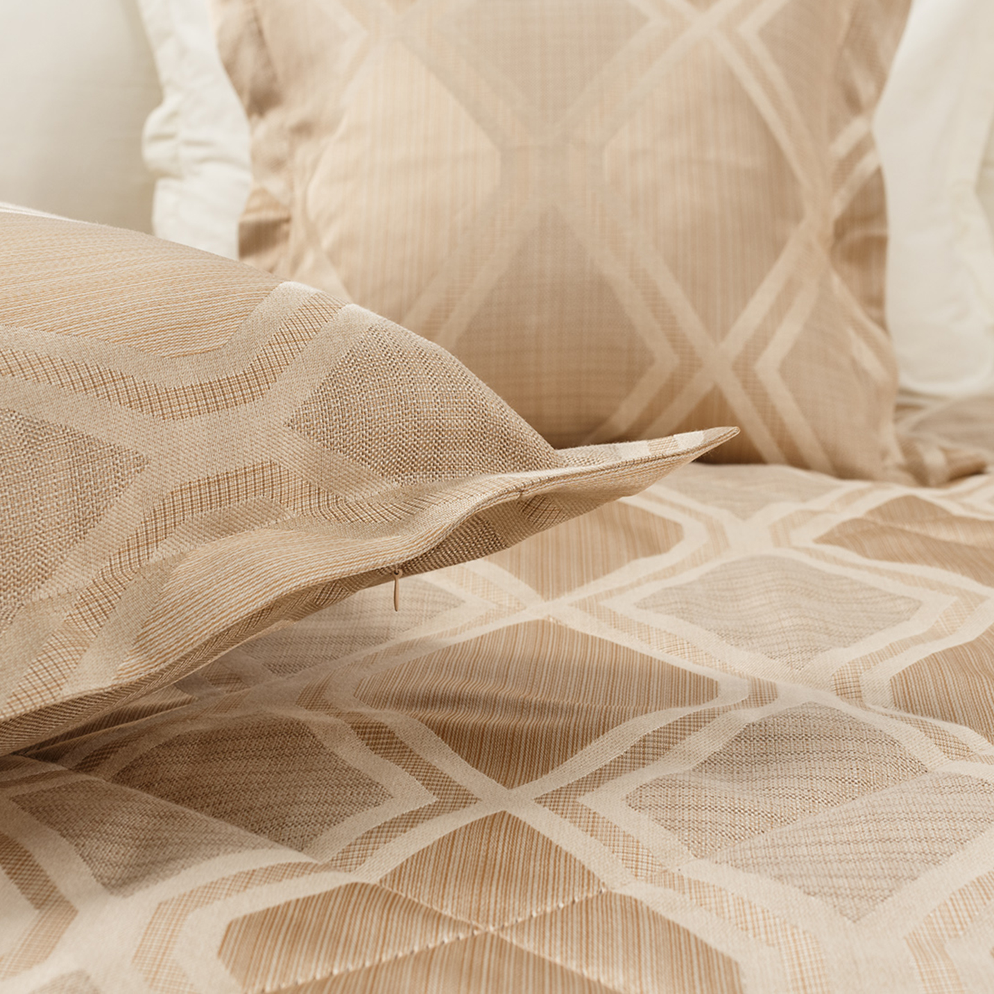 Оригинальный геометричный орнамент привносит особый ритм и стиль в интерьер, а утонченные молочные оттенки уравновешивают, дарят спокойствие и безмятежность ночных сновидений.