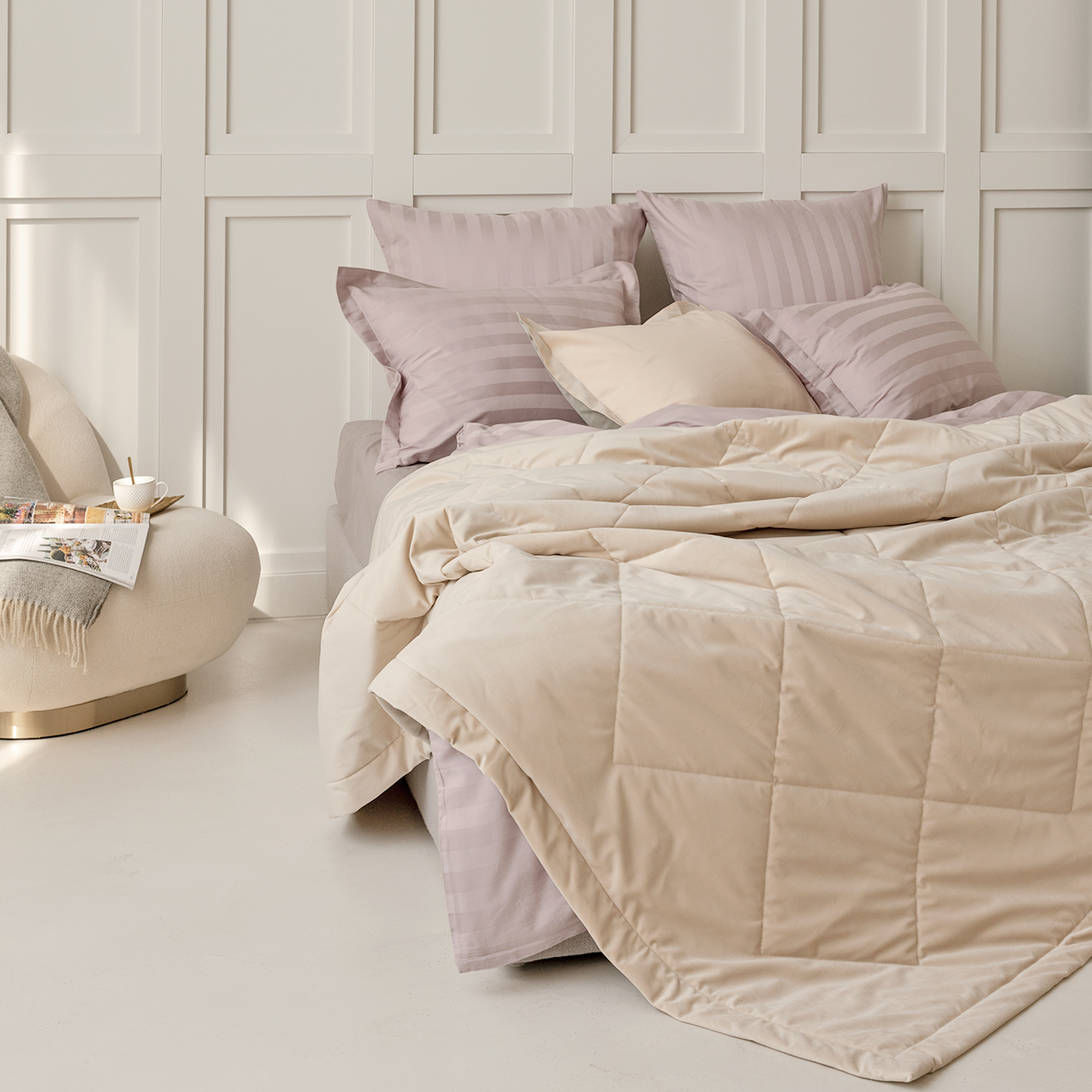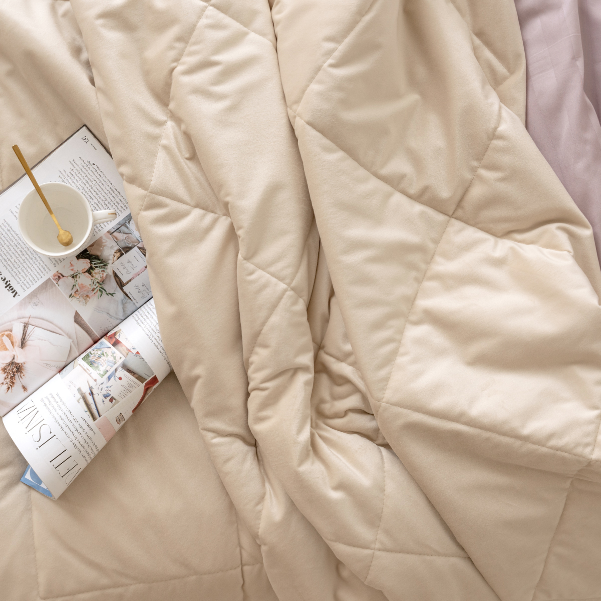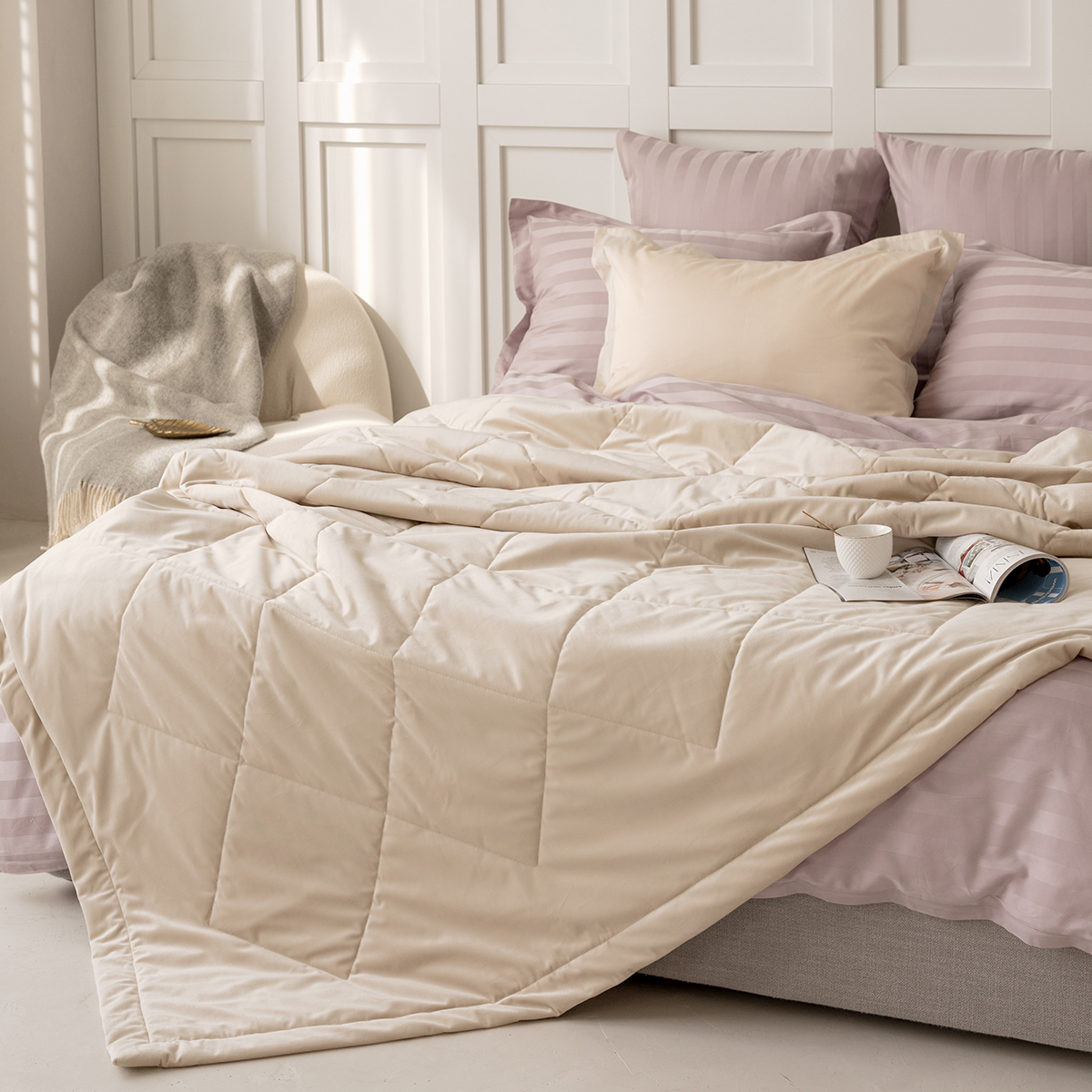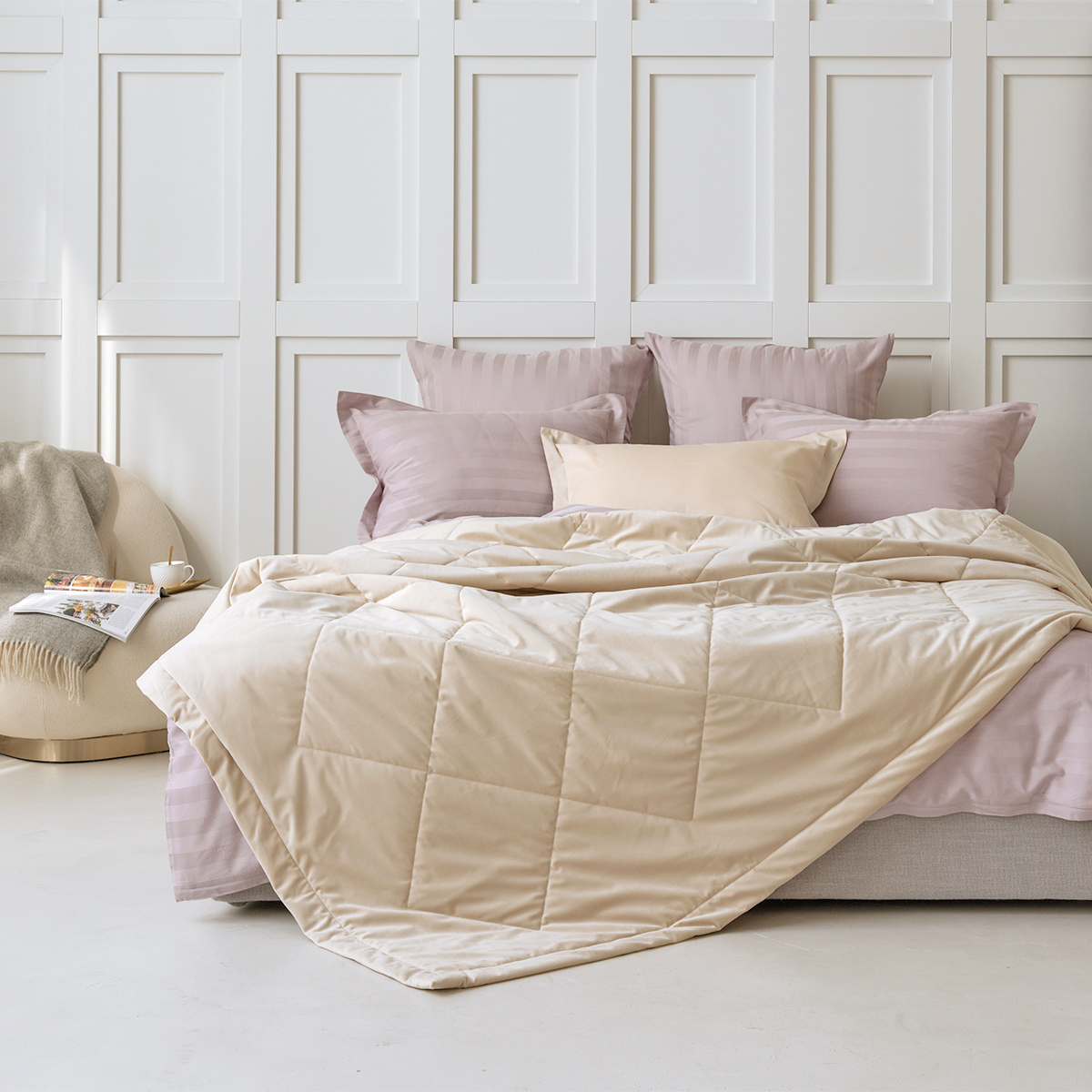 Состав: бархат 100% пэ, наполнитель - полиэфирное волокно. Подклад покрывала – микрофибра велюр, за счет своей фактуры он предотвращает скольжение покрывала на кровати. Стежка в виде ромбов.