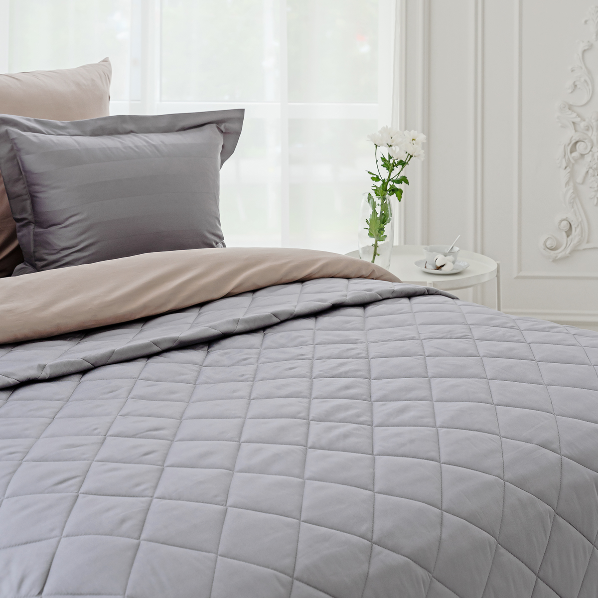 Стеганое покрывало многофункционально: его можно использовать как покрывало для декорирования кровати, так и как легкое одеяло. Покрывало простегано тонким слоем гипоаллергенного наполнителя.
