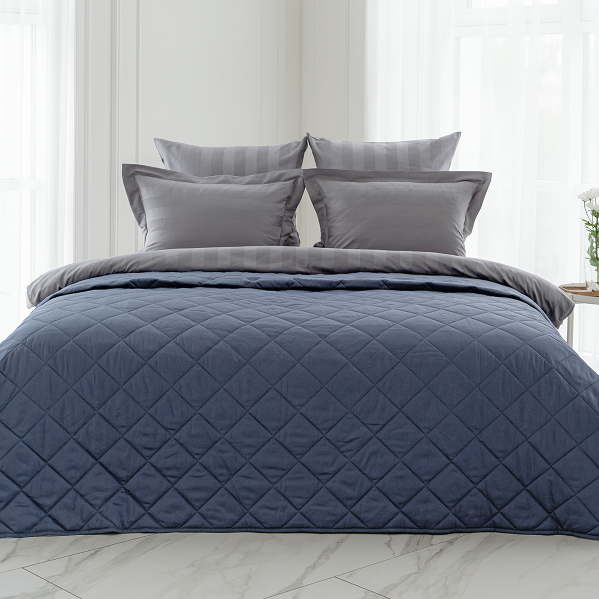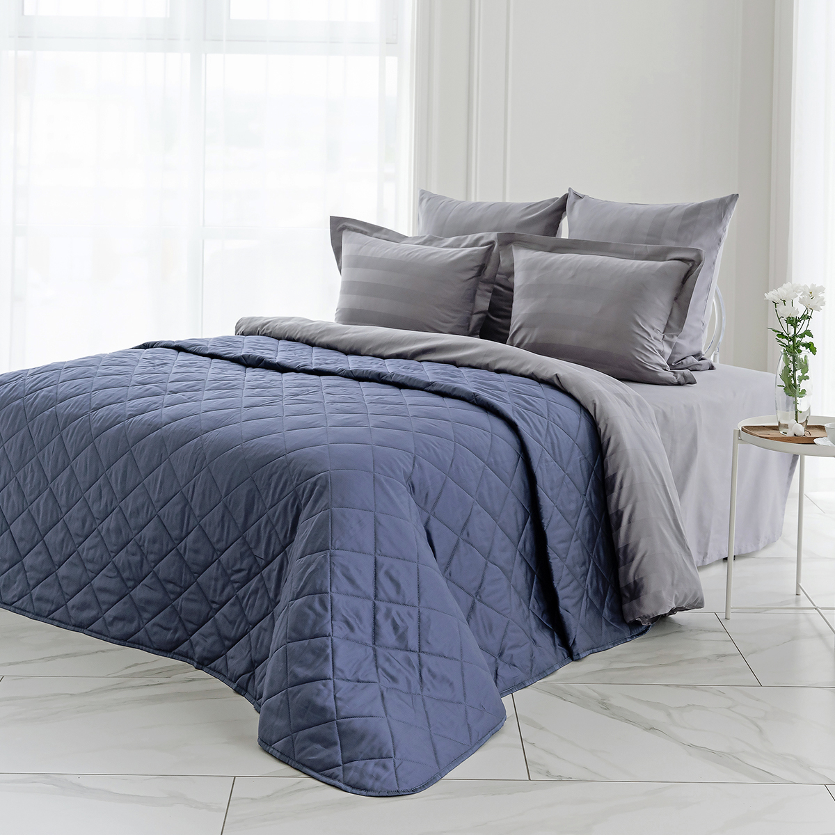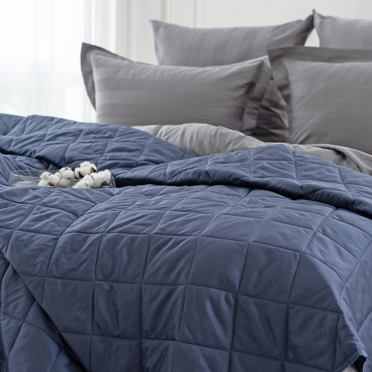 ОСОБЕННОСТЬ модели: хлопковое покрывало на кровать с закругленным уголком, практичной окантовкой по периметру изделия и стильной стежкой в виде ромбов.  Верхняя и нижняя часть покрывала выполнены из высококачественного египетского хлопка – безопасного, натурального и комфортного материала.