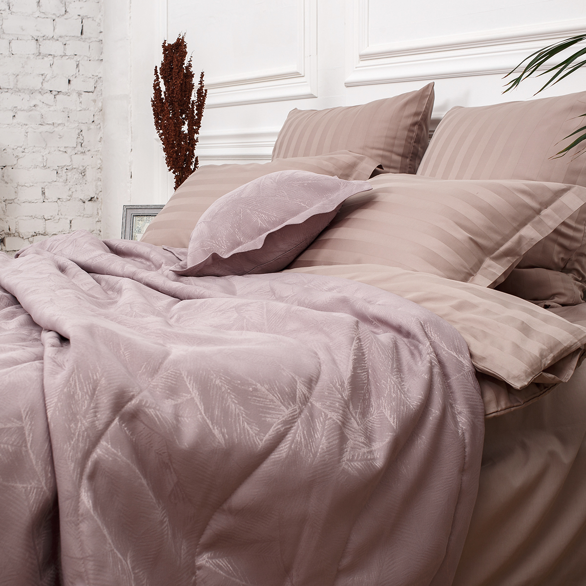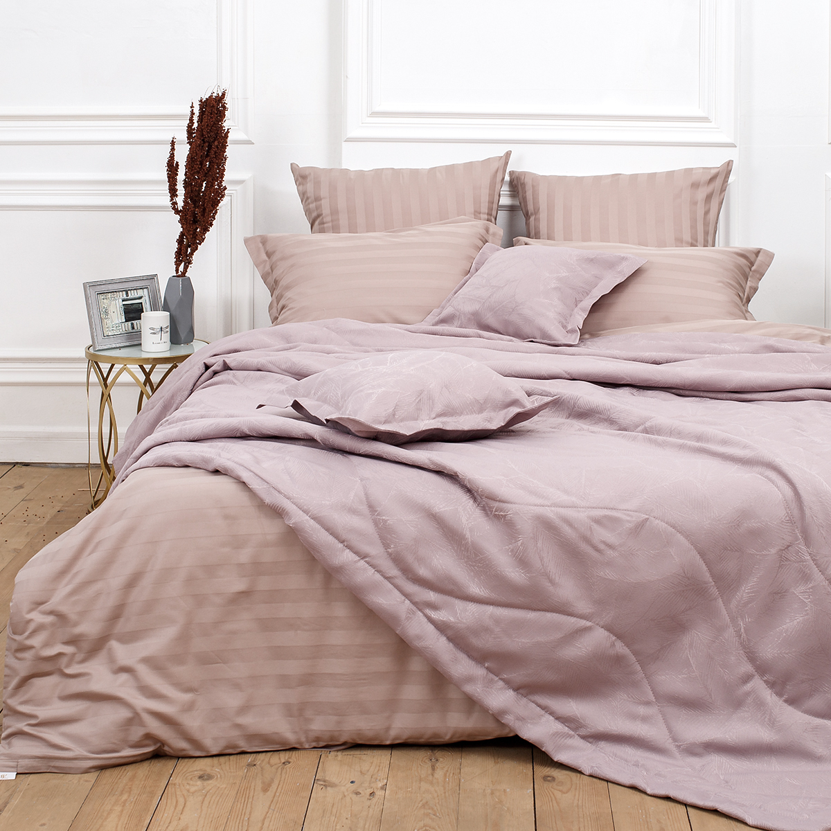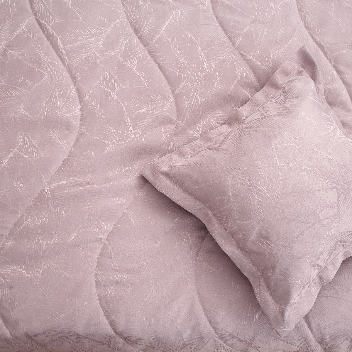 В комплект входит: стеганное покрывало на подкладе размер 240*260 см и 2 декоративные наволочки 45х45 см на молнии. Наволочки с четырех сторон декорированы ушками шириной 4 см.