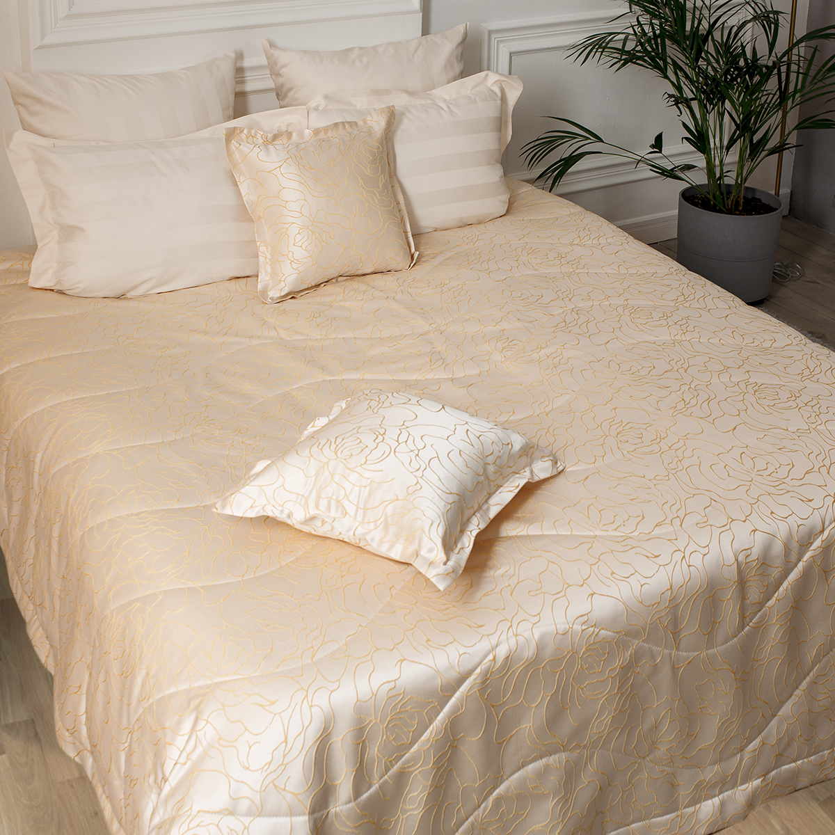 В комплект входит: стеганное покрывало на подкладе размер 240*260 см и 2 декоративные наволочки 45х45 см на молнии. Наволочки с четырех сторон декорированы ушками шириной 3 см.