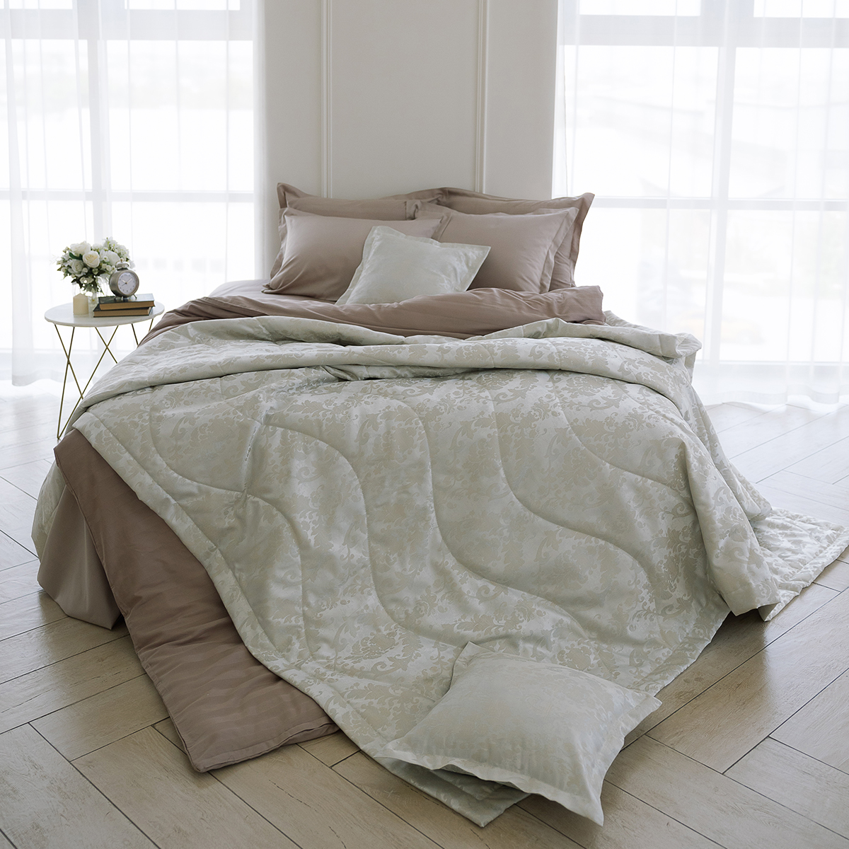 В комплект входит: стеганое покрывало на подкладе размер 240х260 см и 2 декоративные наволочки 45х45 см на молнии. Наволочки с четырех сторон декорированы ушками шириной 4 см.