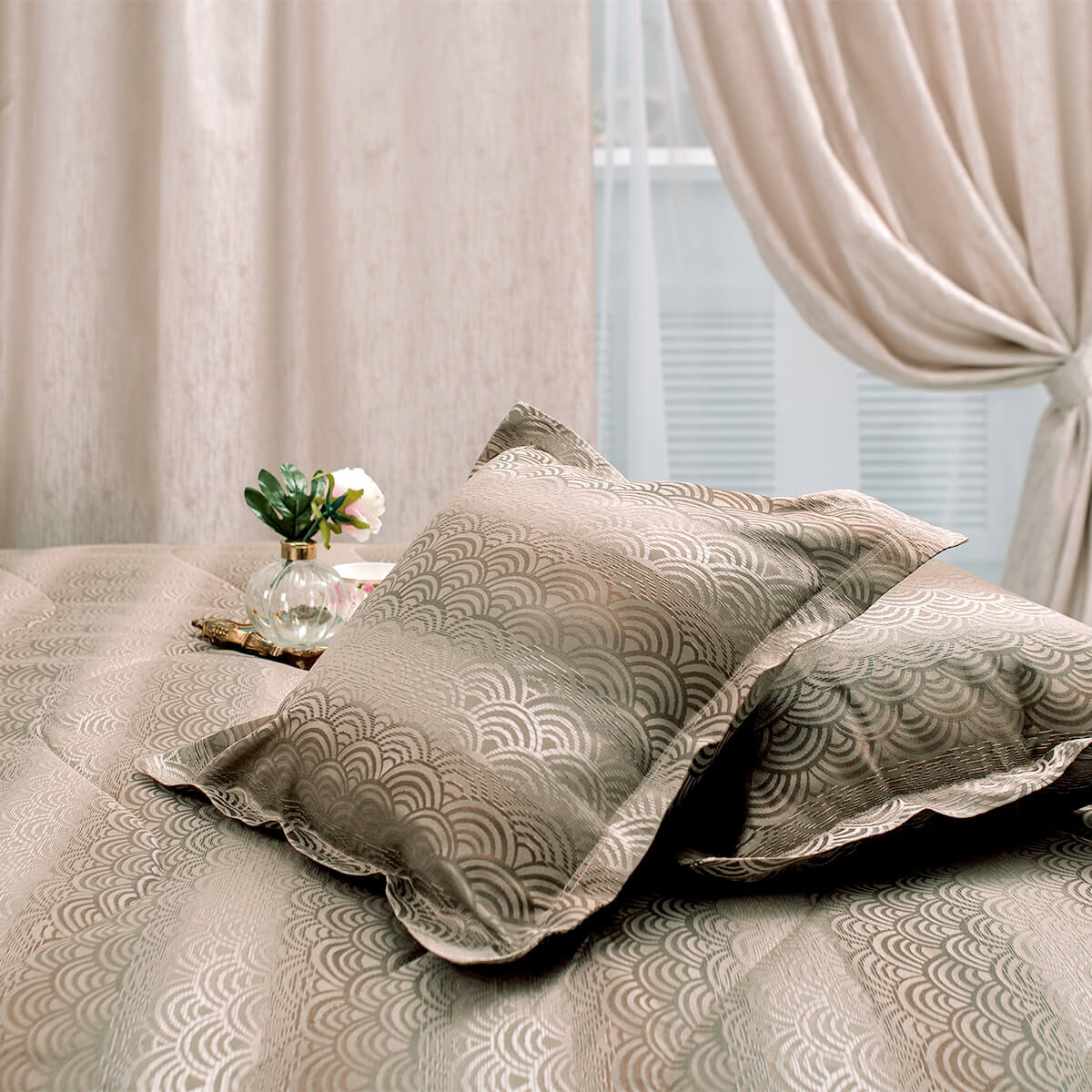 В комплект входит: стеганное покрывало на подкладе размер 240*260 см и 2 декоративные наволочки 45х45 см на молнии. Наволочки с четырех сторон декорированы ушками шириной 3 см.