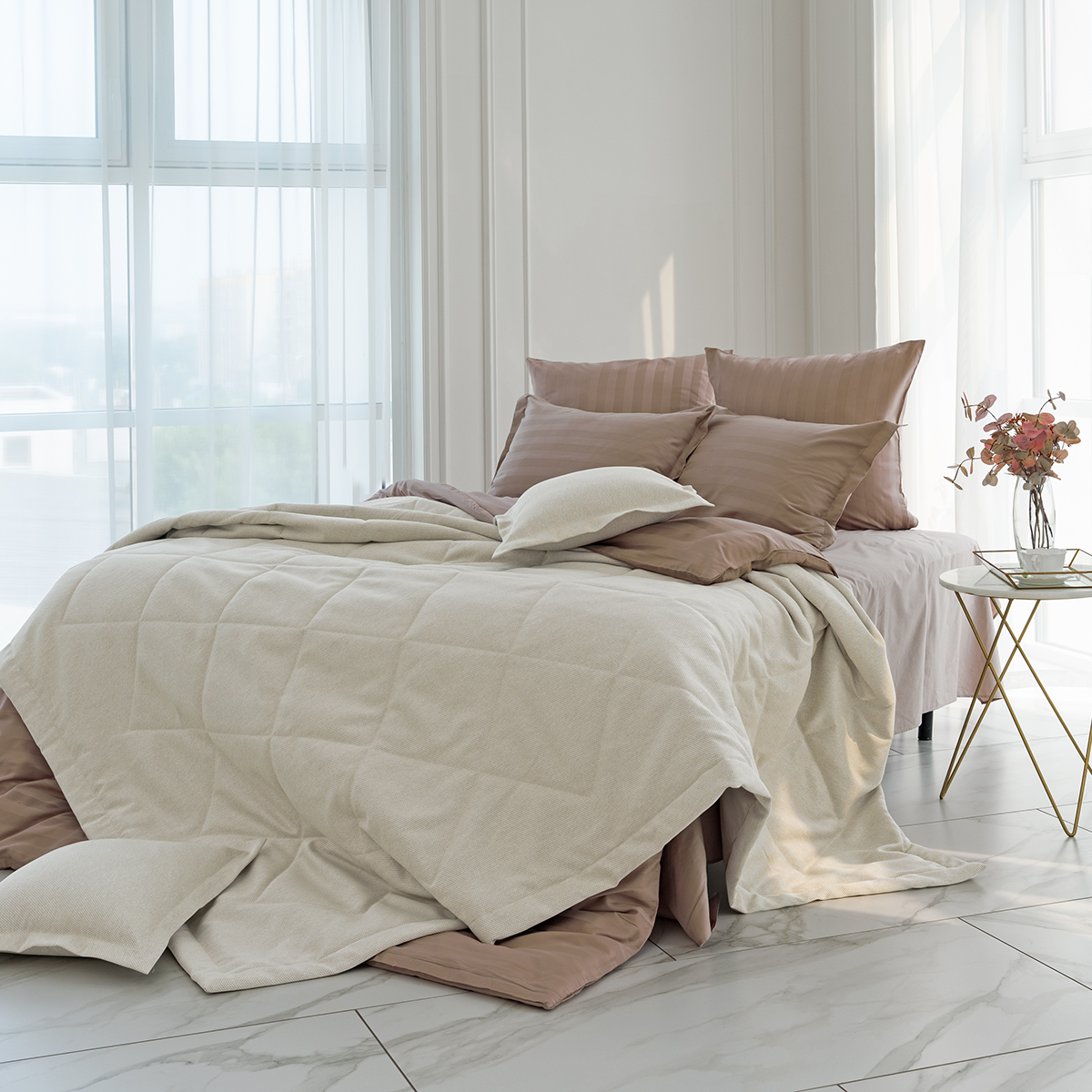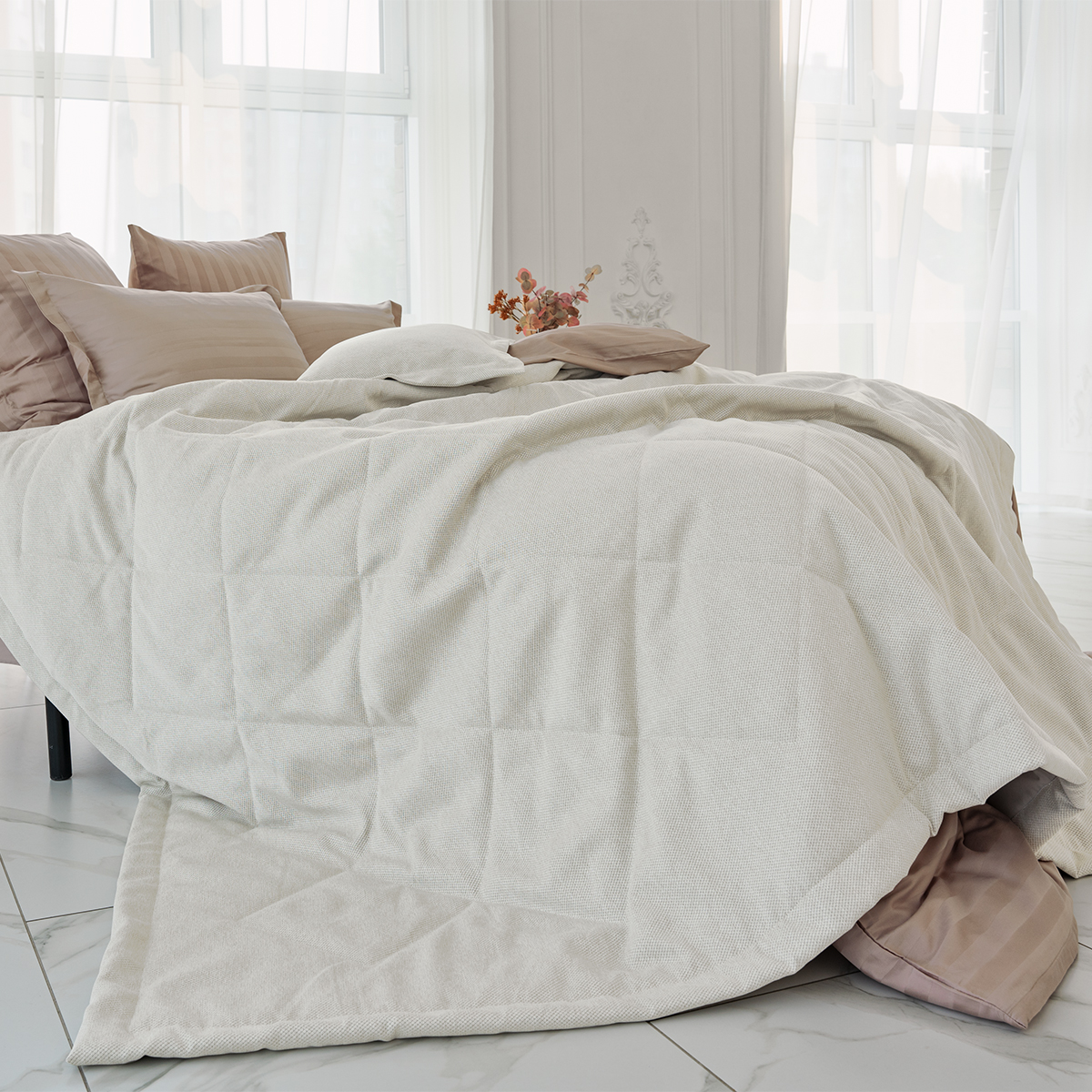 Состав: ткань портьерная 100% пэ - димаут, наполнитель - полиэфирное волокно. Стежка в виде ромбов. Подклад покрывала – микрофибра велюр, за счет своей фактуры он предотвращает скольжение покрывала на кровати.