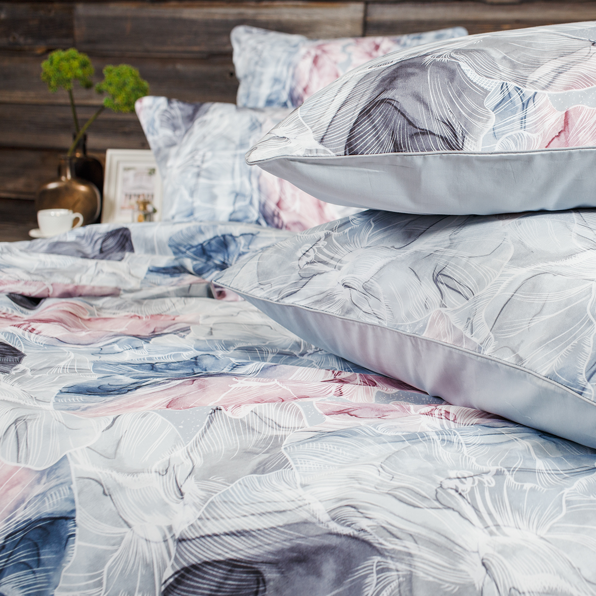 - Наволочки двухсторонние: лицевая сторона – абстракция, оборотная – однотонная. Декоративный кант по трем сторонам наволочки. Широкий запах на наволочках - легко менять подушки.