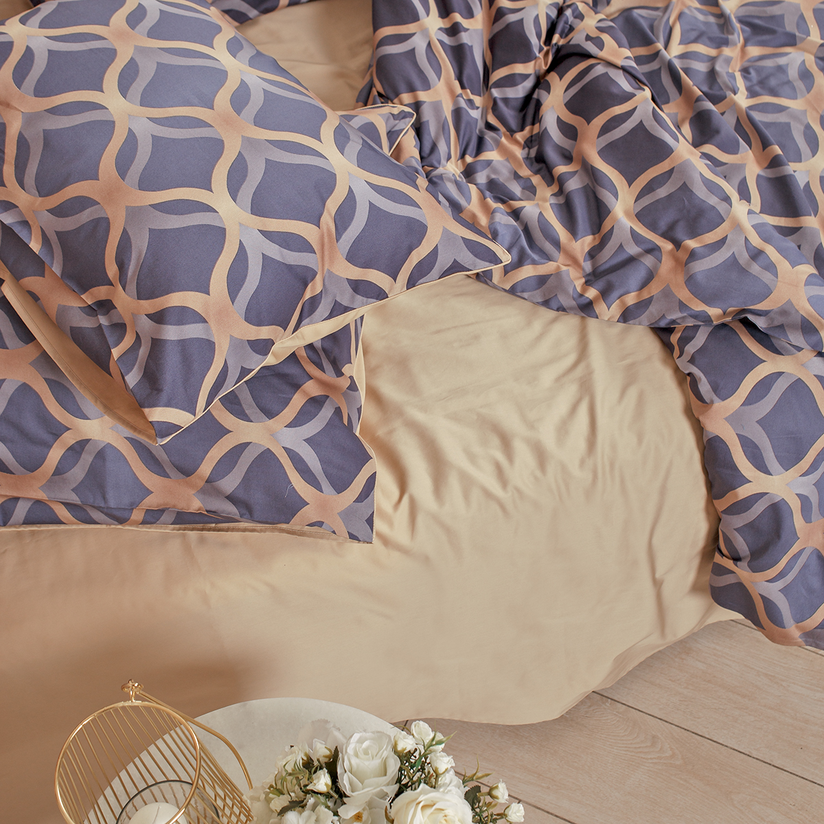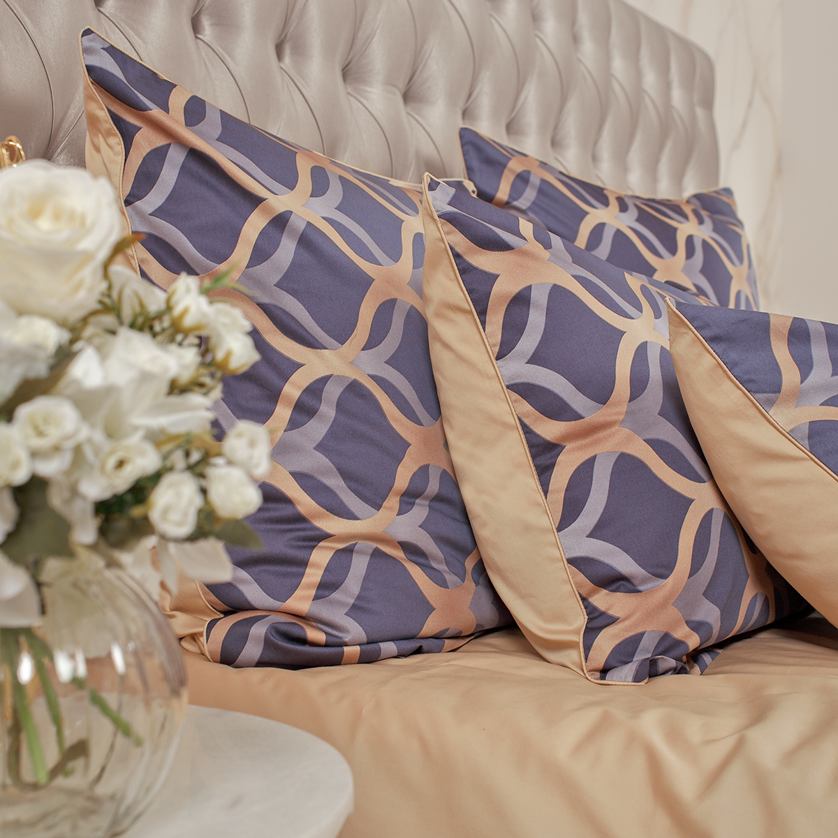 - Наволочки двухсторонние: лицевая сторона – орнаментальный принт, оборотная – однотонная. Декоративный кант по трем сторонам наволочки. Широкий запах на наволочках - легко менять подушки.