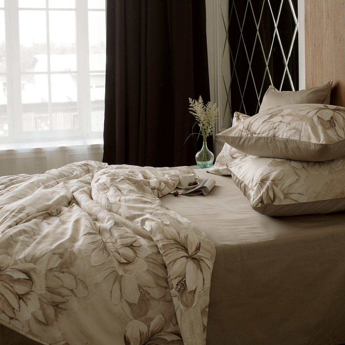 В ткани мако-сатин, из которой произведена коллекция, используется более тонкая 60-я нитьПлотность ткани 300 ТС. За счет специальной скрутки нити, ткань получается очень мягкая и приятная на ощупь.