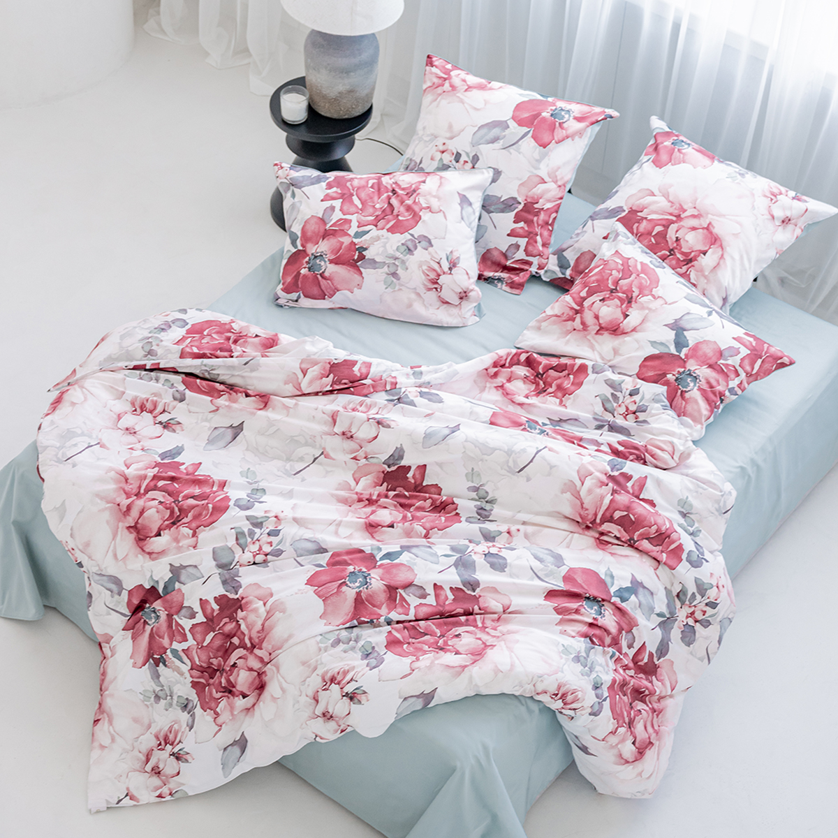 Эффектный акварельный принт, созданных искусным художником. Яркая и сочная красота крупных бутонов чарует и манит… Изящество и нежную красоту роскошного дизайна подчеркивает нежный белоснежный фон комплекта.