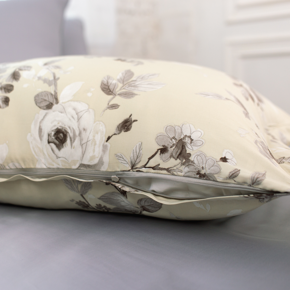- 4 наволочки в комплекте: 50х70см - декоративные ушки 4 см с двойной отделочной отсрочкой по трем сторонам наволочки. «Невидимая» молния по широкой стороне наволочки. 70х70см - двойная отделочная отсрочка по 3м сторонам наволочки. «Невидимая» молния по нижнему краю наволочки.