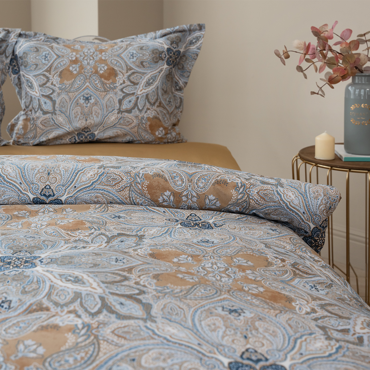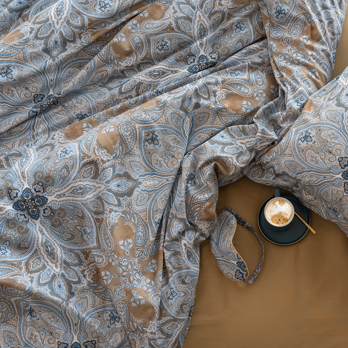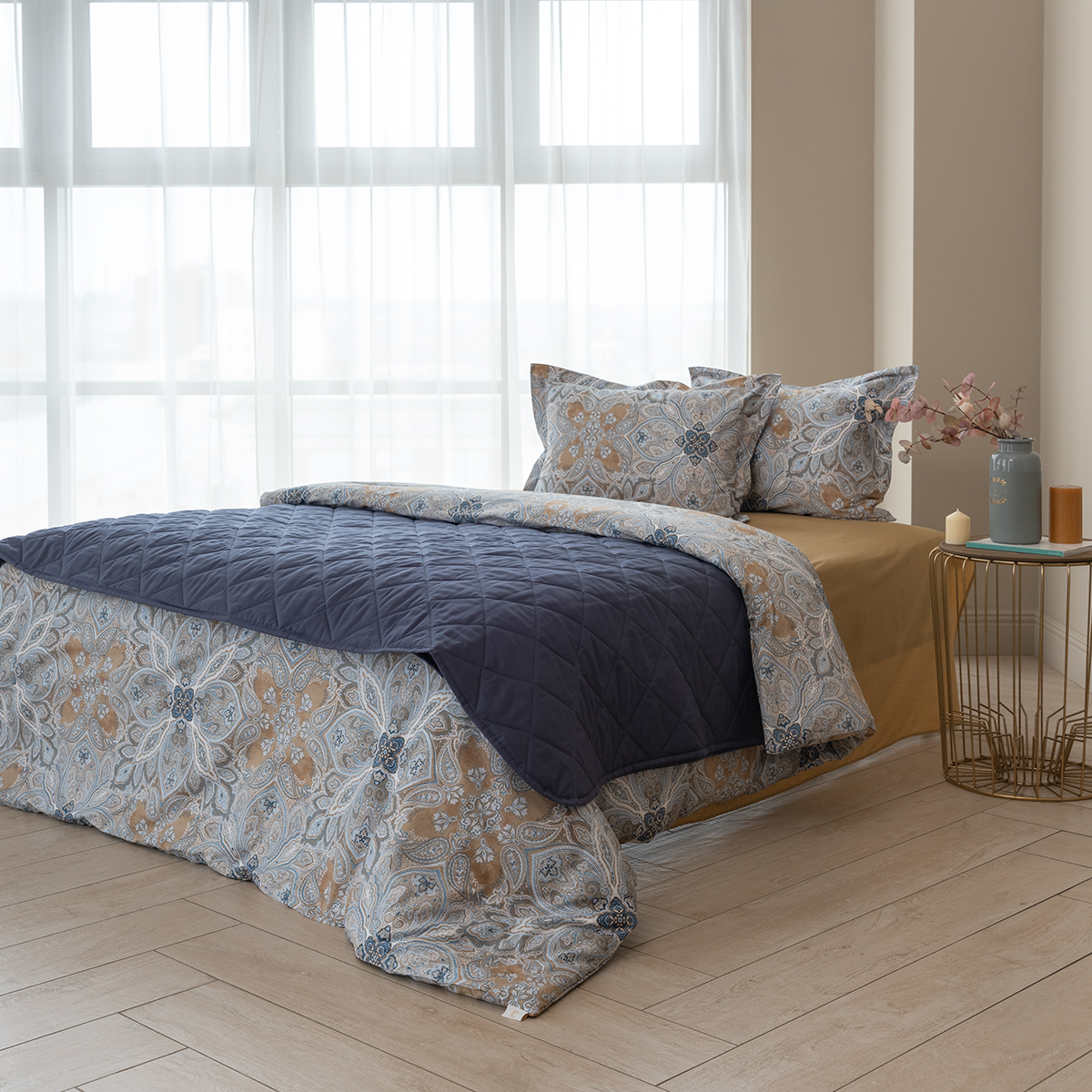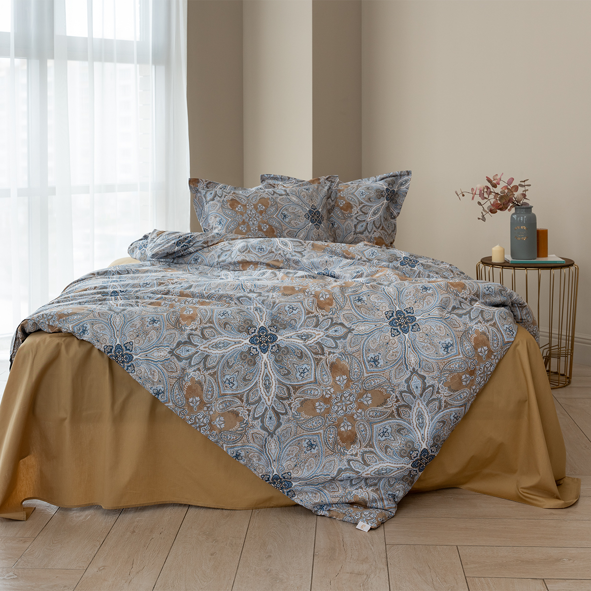 Завораживающий и манящий восточный орнамент, он всегда актуален. Дизайн стильно подчеркнут универсальной и гармоничной палитрой песочных и серо-голубых оттенков. Эксклюзивные печатные принты созданы в собственной дизайн студии La Prima.