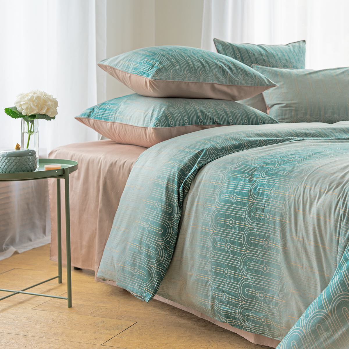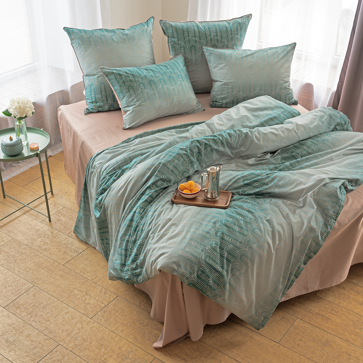Постельное белье «Массимо» - чарующий градиент от глубокого нефритового оттенка до мягкого бежевого. Изящные линии орнамента напоминают стилизованную решетку итальянских палаццо.