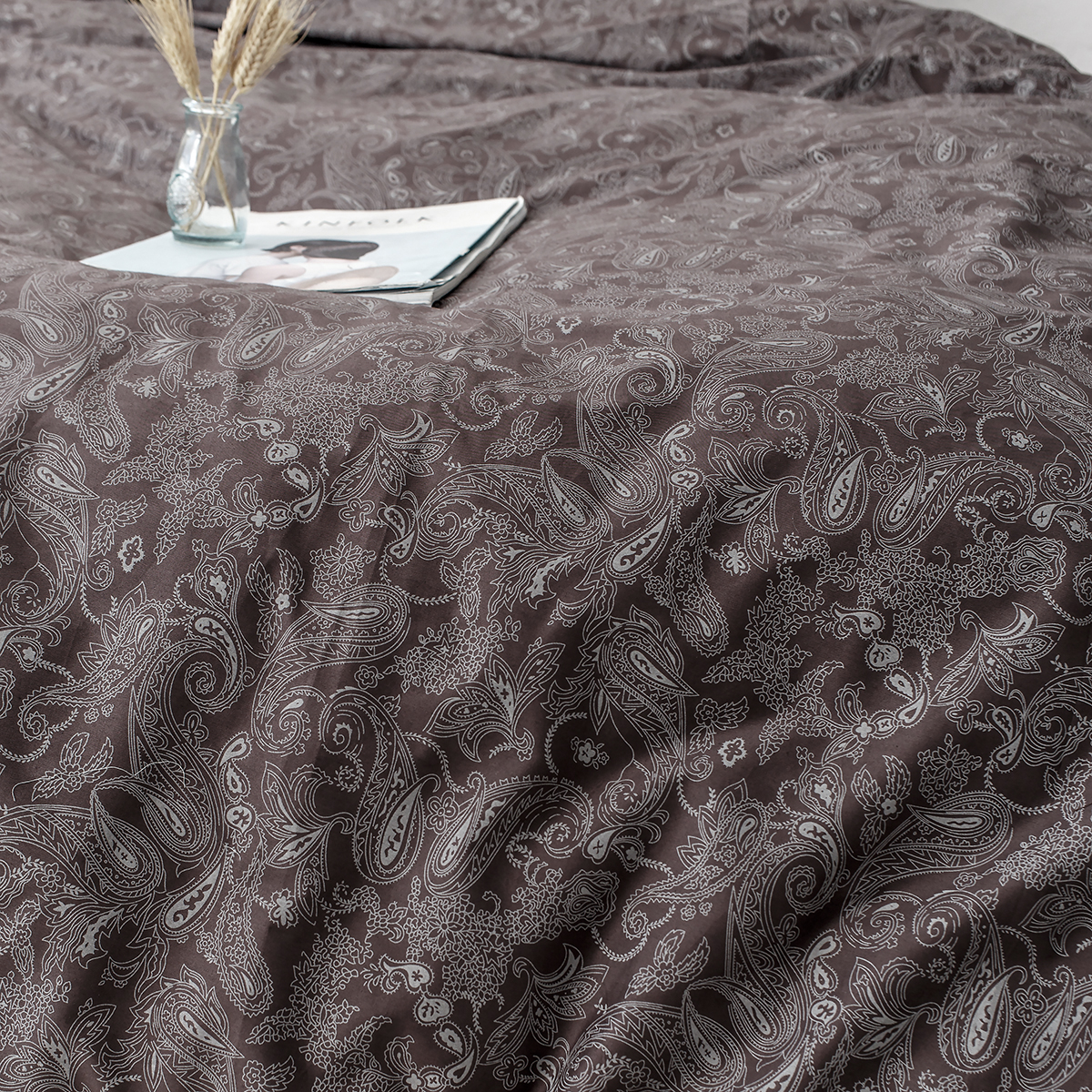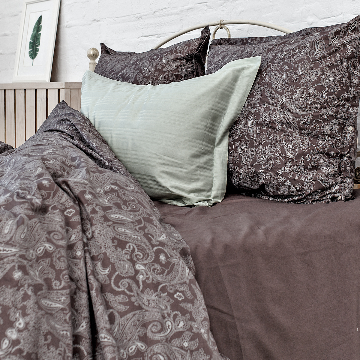 Комплект постельного белья выполнен из 100% хлопка, сатиновое переплетение, плотность ткани - 205 нитей/см2. Изюминка коллекции - орнаментальный рисунок Paisley. Наволочки с трех сторон декорированы ушками шириной 2,5 см.