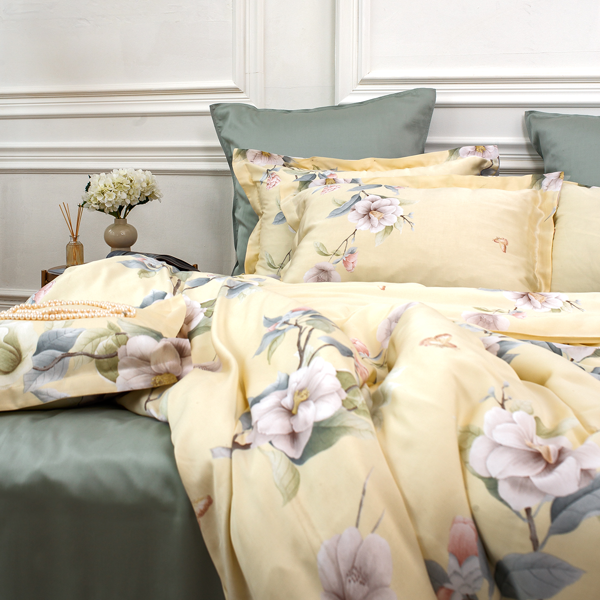 Крупные и одновременно изящные цветы и порхающие бабочки на пастельно-желтом фоне – ощущение блаженства, неги и абсолютного счастья.