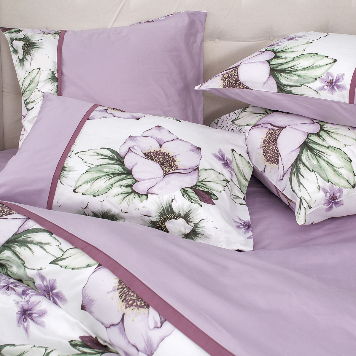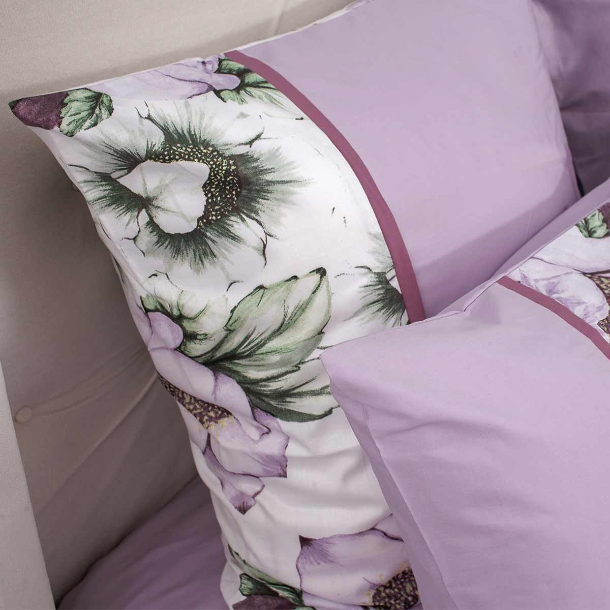 - Наволочки и пододеяльник изготавливаются из тканей двух видов: с рисунком и однотонной. Контрастная декоративная отделка эффектно и в то же время гармонично соединяет все элементы в единый шикарный ансамбль.