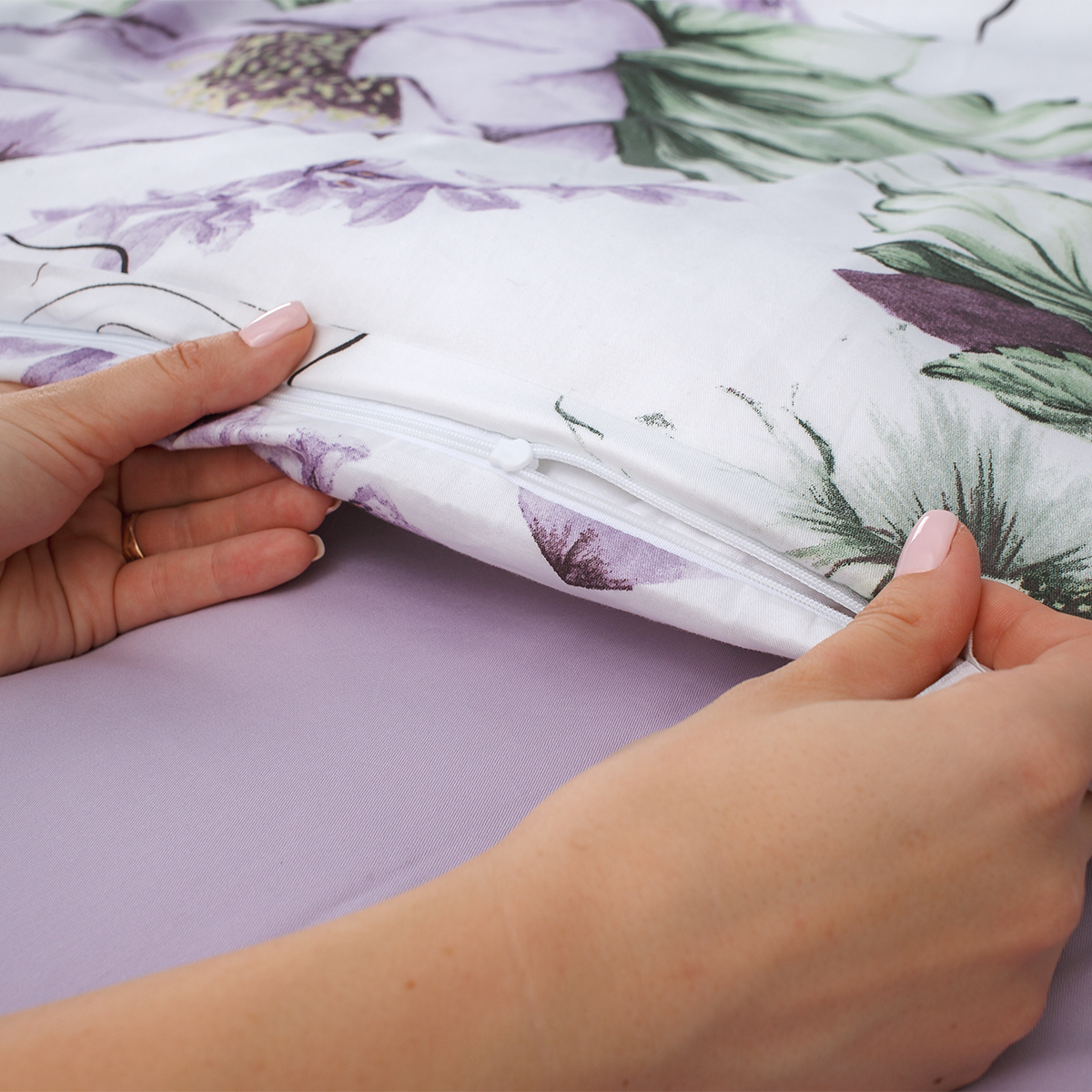 - «Невидимая» молнияво всю ширину по нижнему краю пододеяльника. Для быстрой и удобной смены постельного белья в верхней части пододеяльника расположены клапаны для рук. Сменить пододеяльник можно за 30 секунд.
