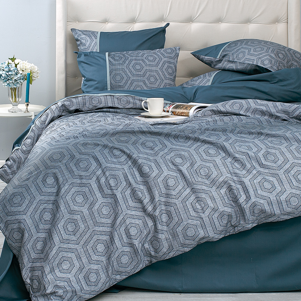 Смелый и дерзкий... Ультрамодная игра сочетаний: стильный геометрический орнамент, замысловатая архитектура ломанных линий и форм удачно подчеркивает стиль и лаконичность современного интерьера. Особую брутальность комплекту придают глубокие и насыщенные лазурно-изумрудные оттенки.