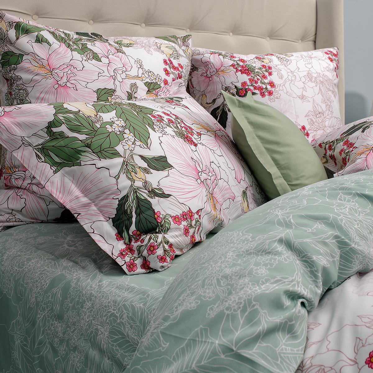 Цветущий сад, будто окутанный волшебным флером изящных цветочных композиций. Дополнен зеленым оттенком шалфея, который вносит модную и очаровательную нотку свежести в интерьер спальни.