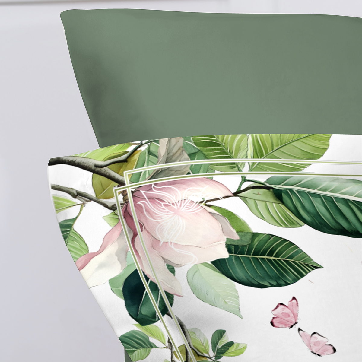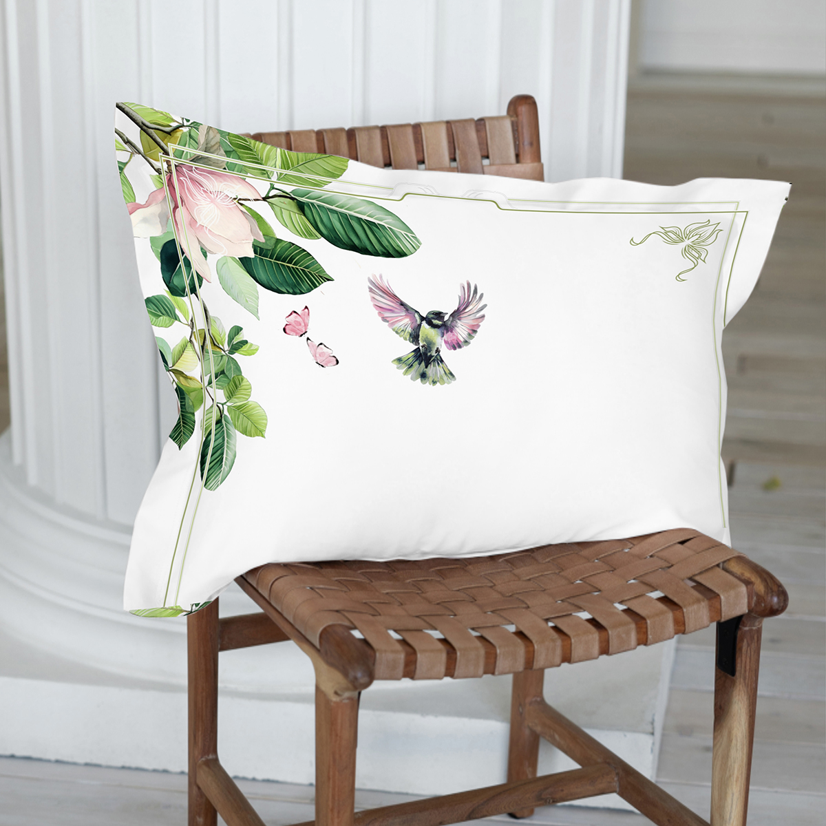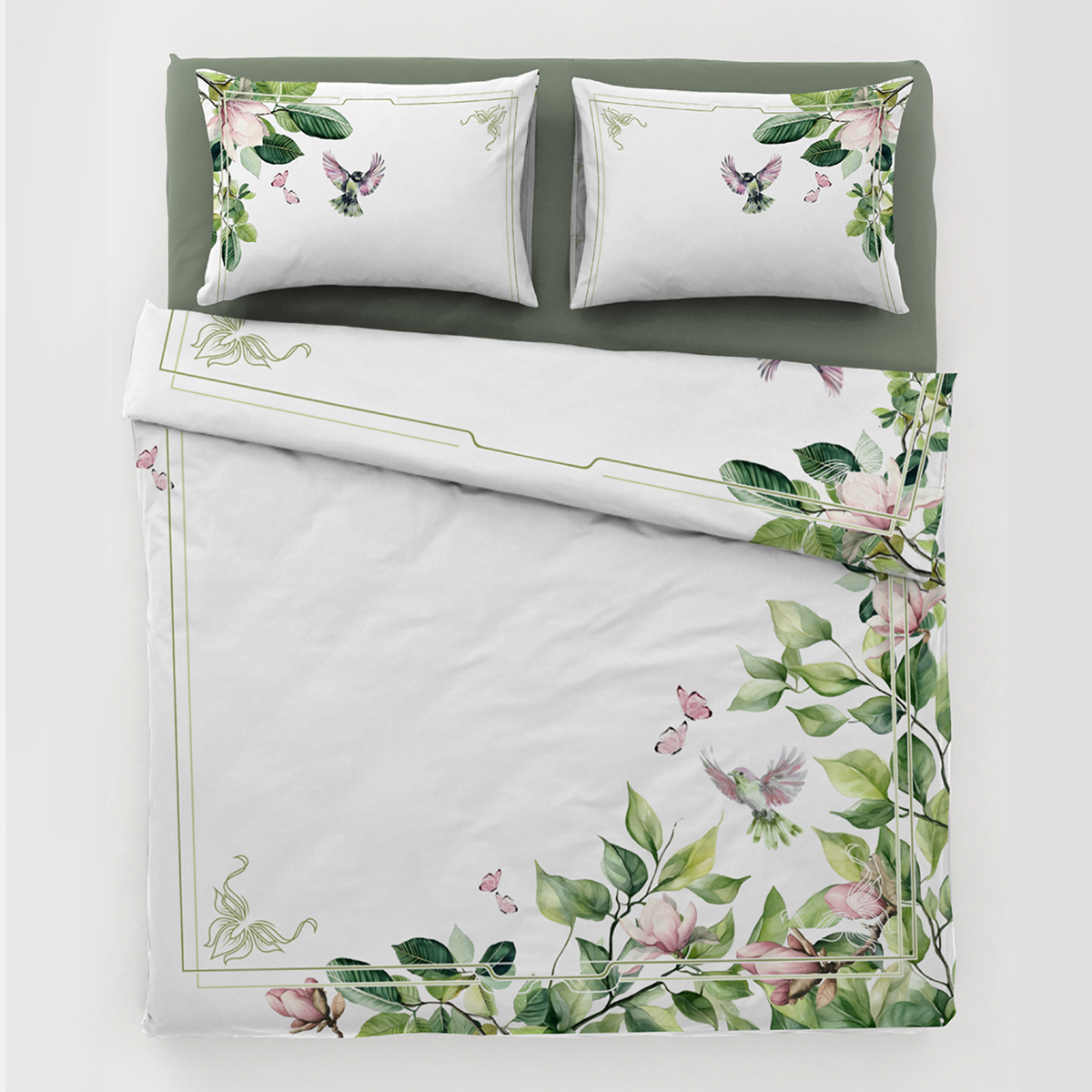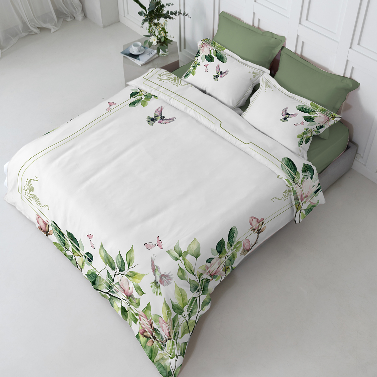 Как живописное полотно в зелёной раме: сочные листья обрамляют спальное место, будто музейный багет. А райские птички и бабочки – будто ожившие персонажи картины, которые решили поселиться в вашей личной галерее сна вот-вот вспорхнут с подушки.