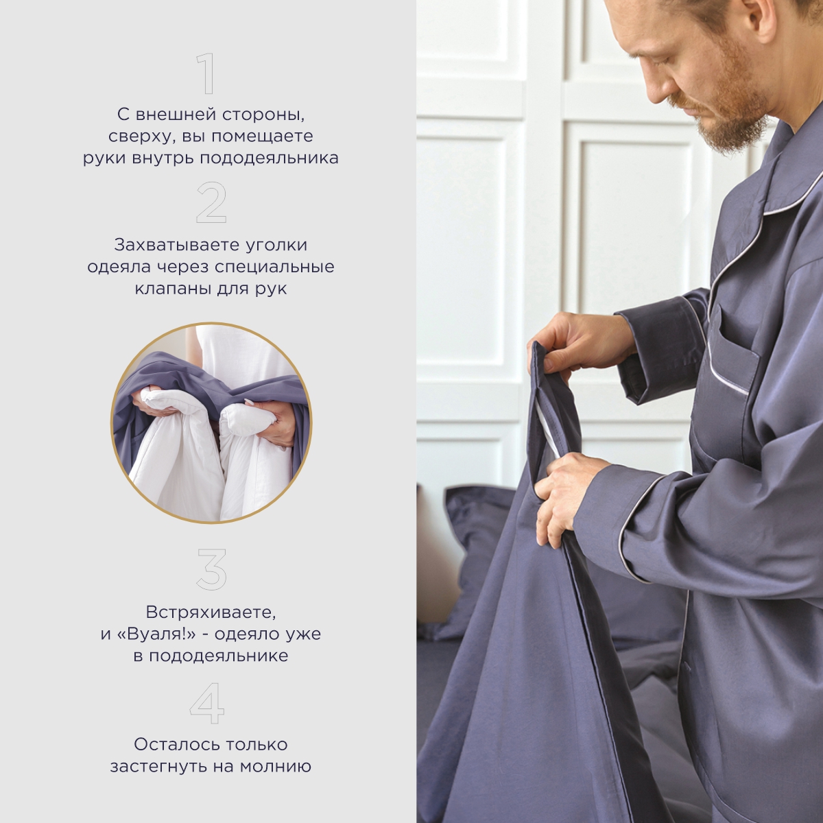 ПОДОДЕЯЛЬНИК С КЛАПАНАМИ ДЛЯ РУК — это то, с чем вы перестанете тяжело вздыхать при вдевании одеяла. Молния во всю ширину пододеяльника в цвет комплекта. Как это работает: