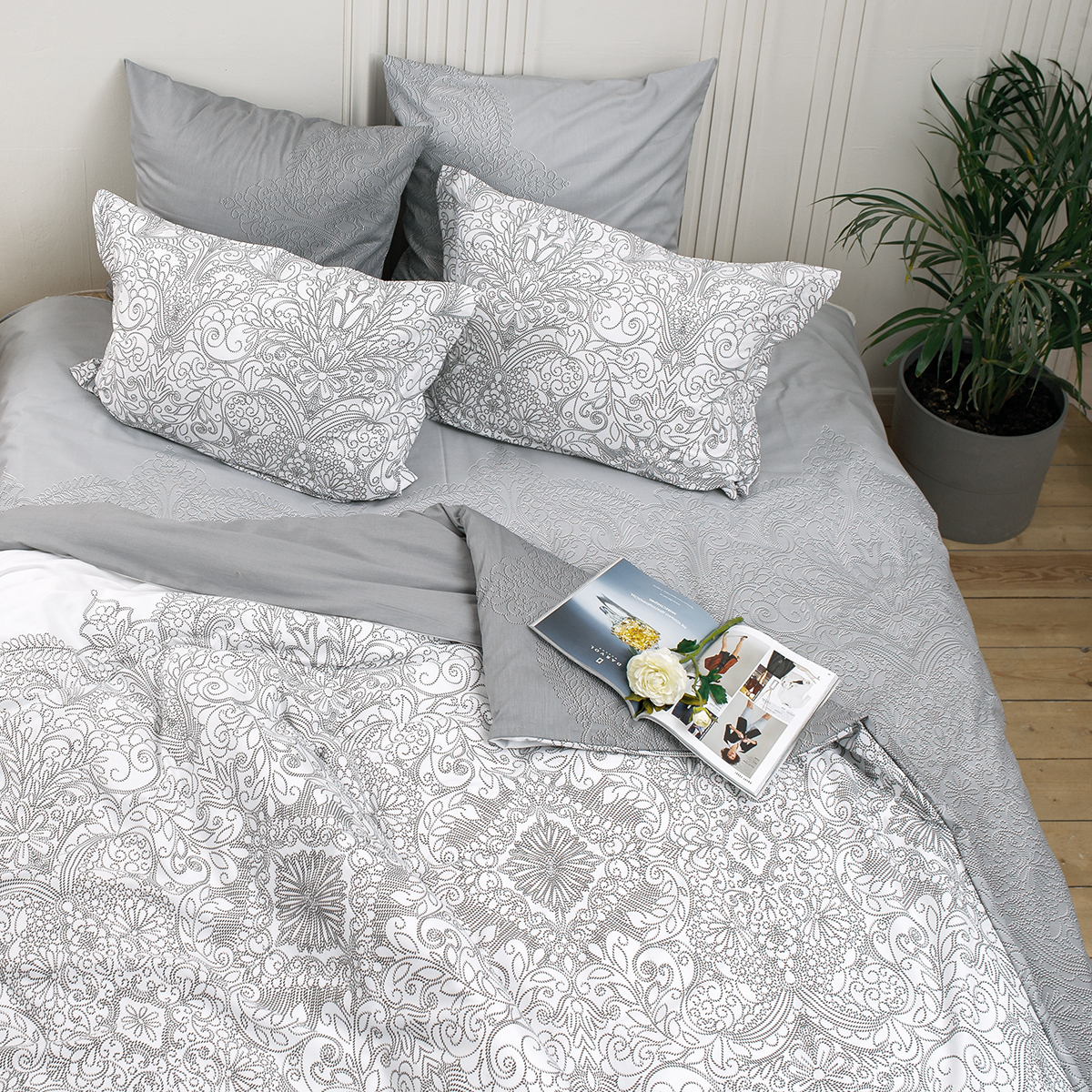 Сочетание двух монохромных оттенков и стильного, необычного орнамента превращает такое постельное белье в одновременно универсальное и изысканное украшение спальни. Наполняет пространство спокойствием, умиротворением и ощущением стабильности, смотрится нарядно и в тоже время сдержанно.