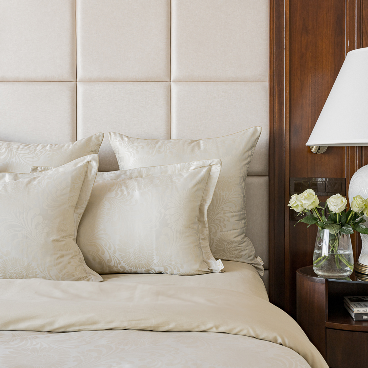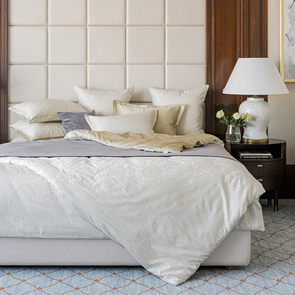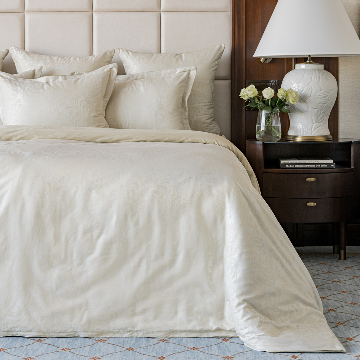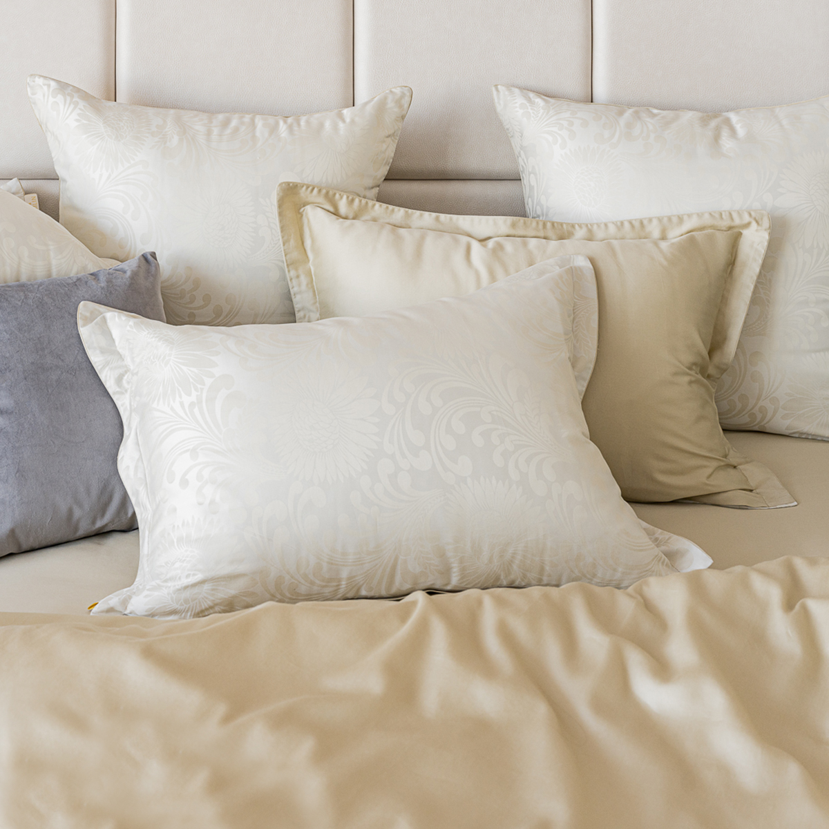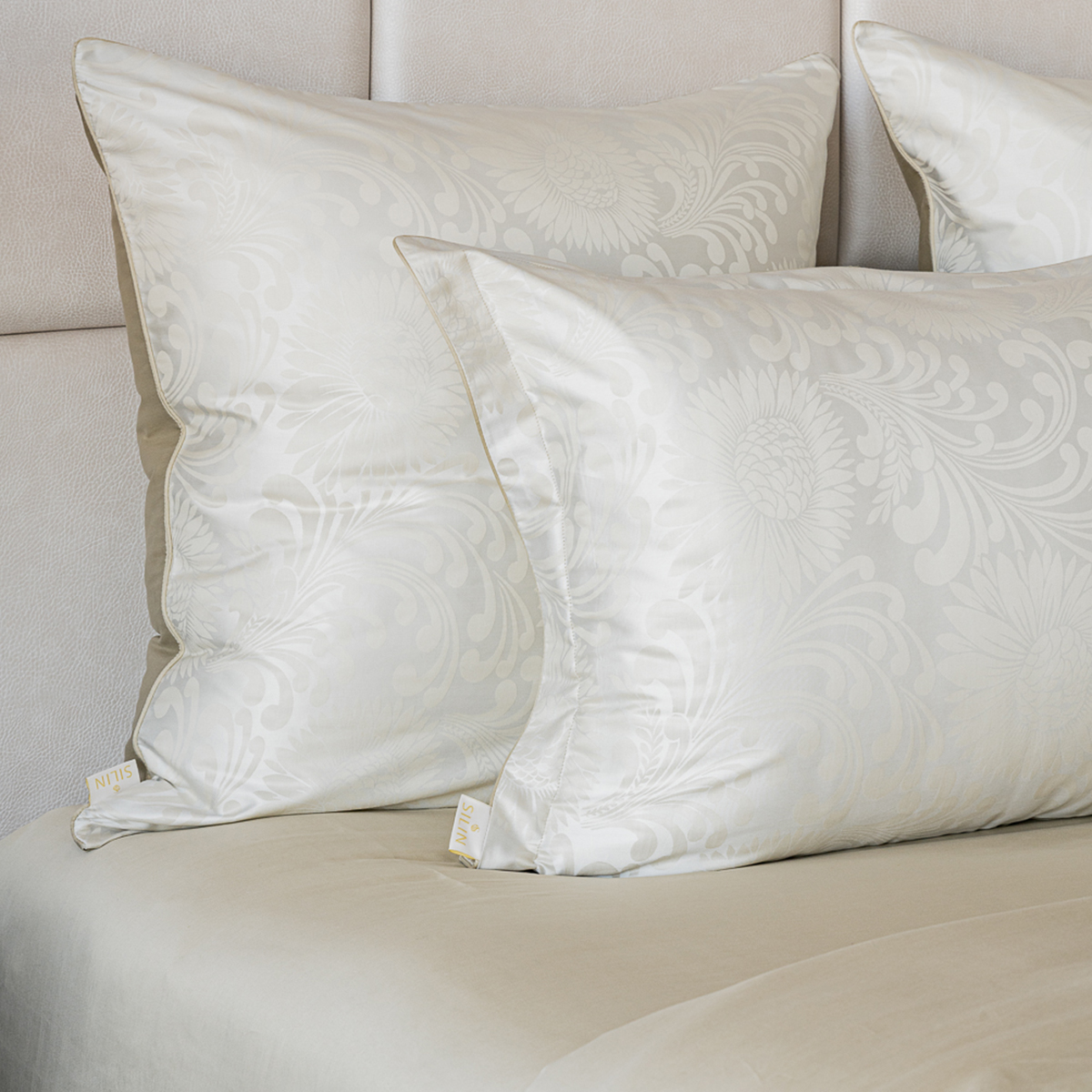 • Лицевая сторона наволочек и пододеяльника выполнена из жаккардовой ткани, оборотная из премиального длинноволокнистого хлопка сорта Пима