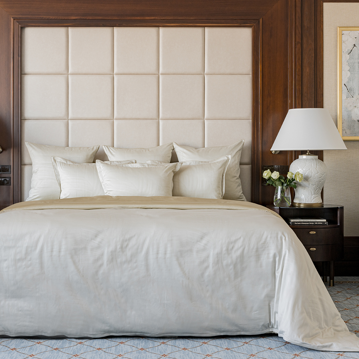 - Лицевая сторона наволочек и пододеяльника выполнена из жаккардовой ткани, оборотная из премиального длинноволокнистого хлопка сорта Пима