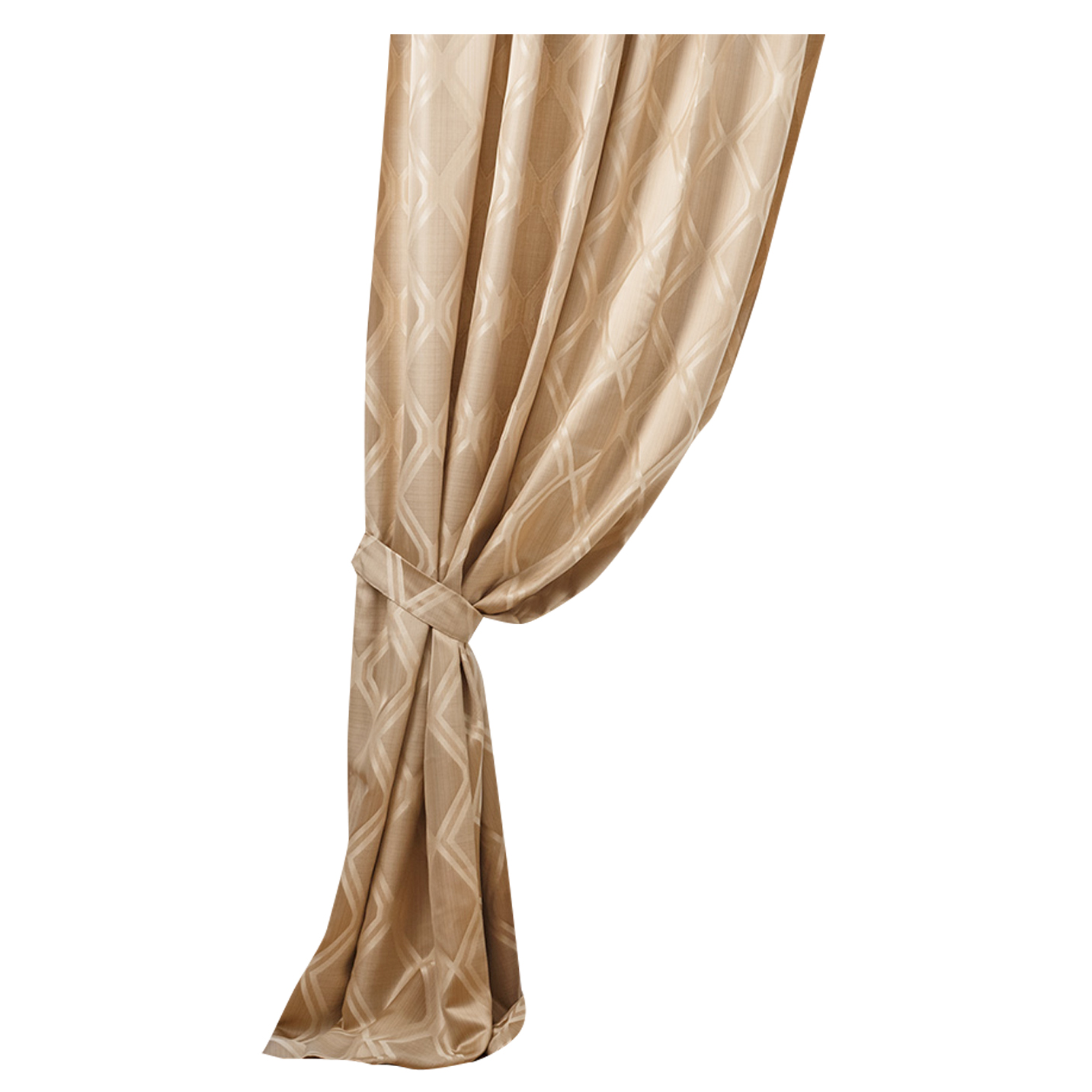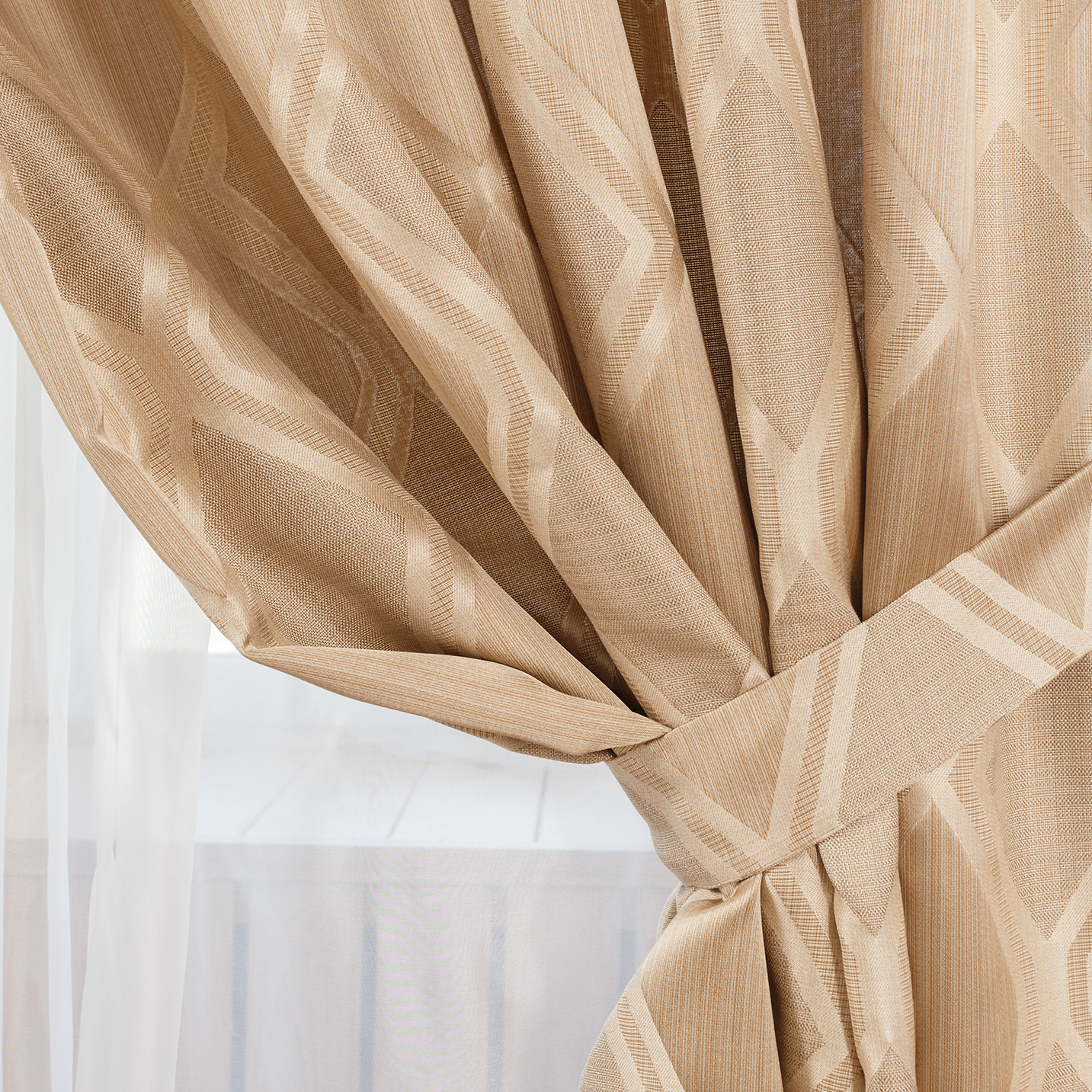 Коллекция «Робертино» выполнена в стиле ар-деко. Шторы выглядят намеренно дорого и элегантно, не кричаще роскошно, а просто ценно. На пастельном бежевом фоне выполнен геометрический рисунок в виде светлых ромбов, что выгодно подчеркивает сияющий фон. Данный дизайн добавит пространства вашему интерьеру и освежит его.